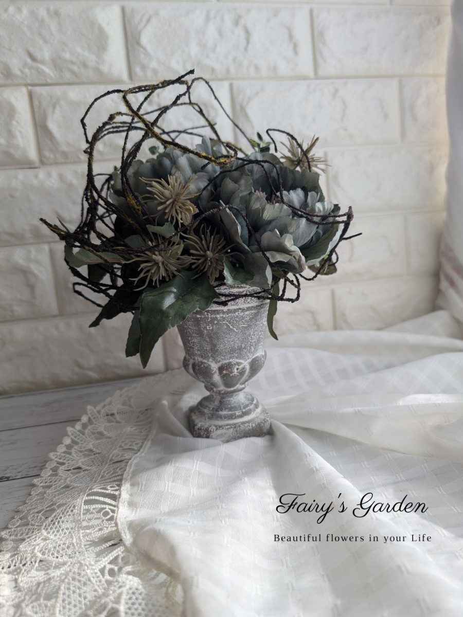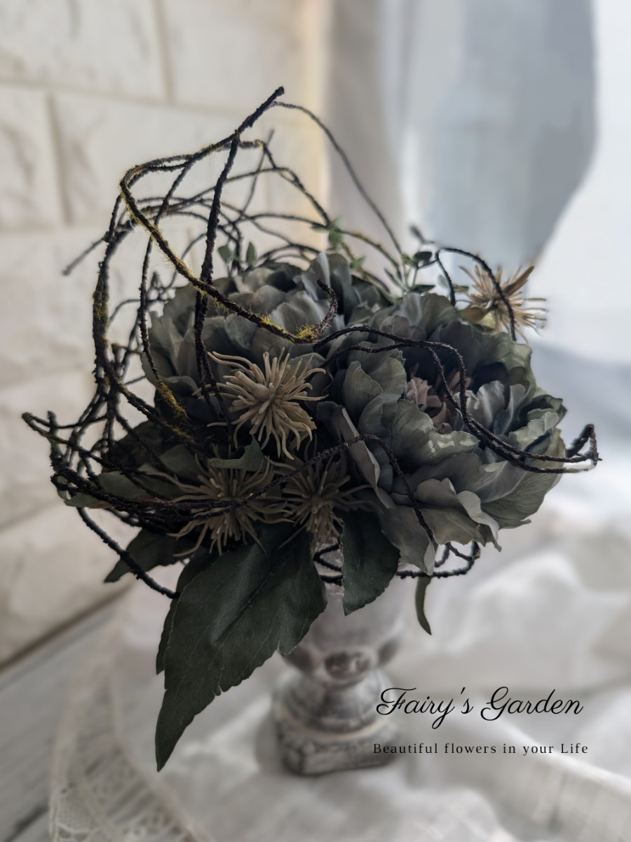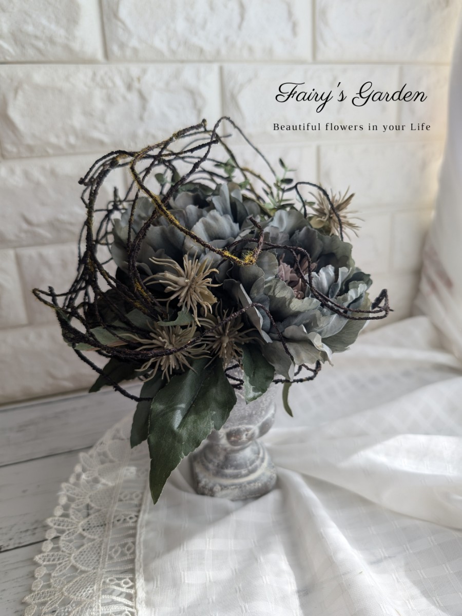 グレーのピオニー(芍薬)にシャビーな質感のユーカリ。