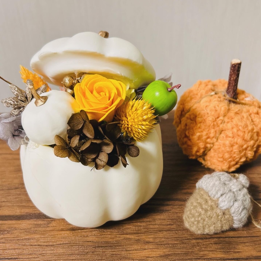 プラスチック製のパンプキン型のポットにハロウィンカラーのソープフラワーやプリザーブドフラワーをアレンジしました。