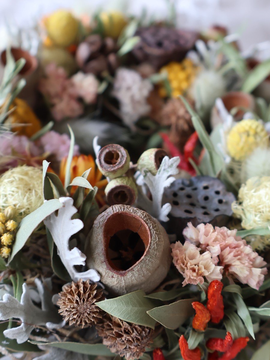 たくさんの木の実とドライフラワーでぷっくり、厚みのある置リースを作製しました。花材をたくさん使用しているので、置いた時前にする場所を変えてお楽しみください。掛けて飾ってもいただけます。