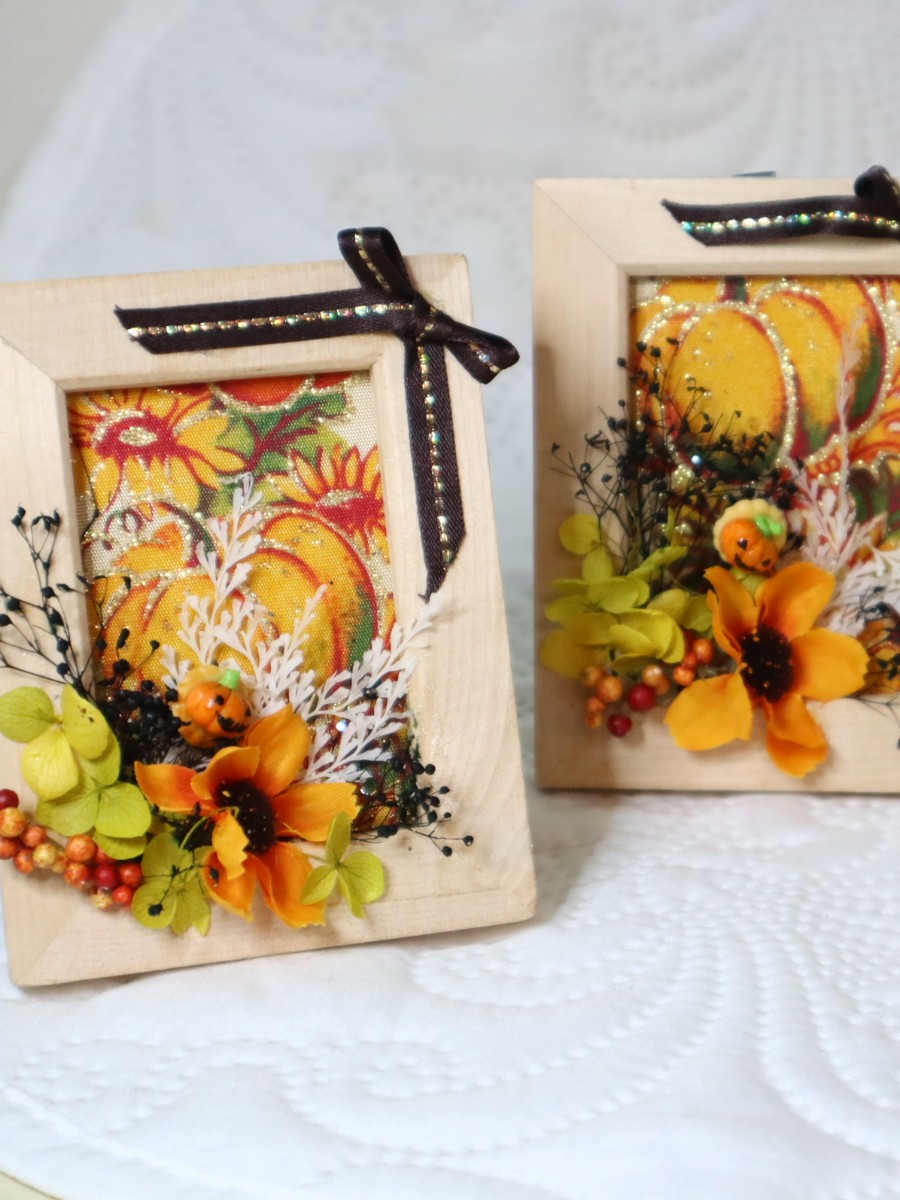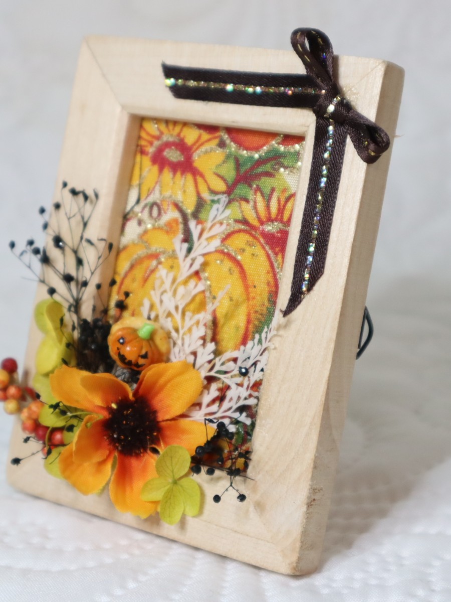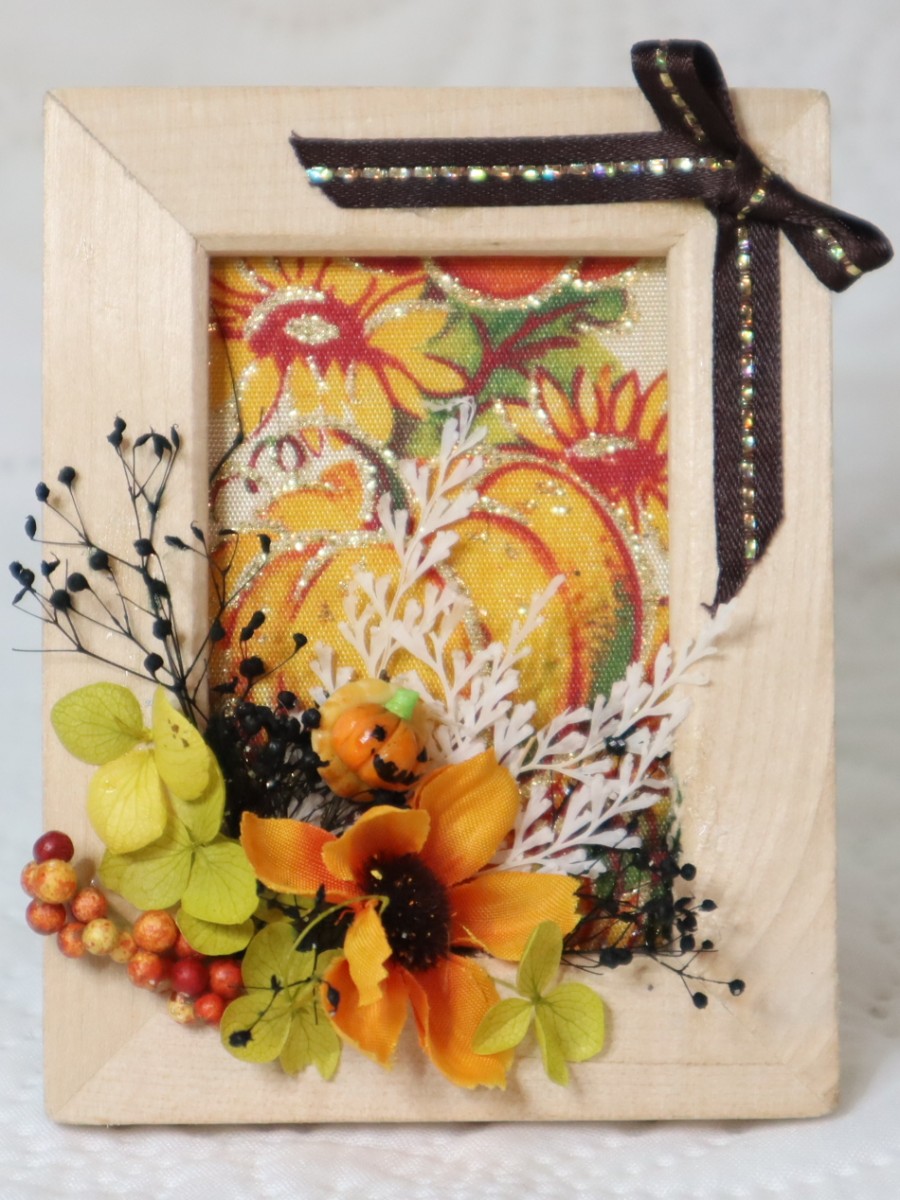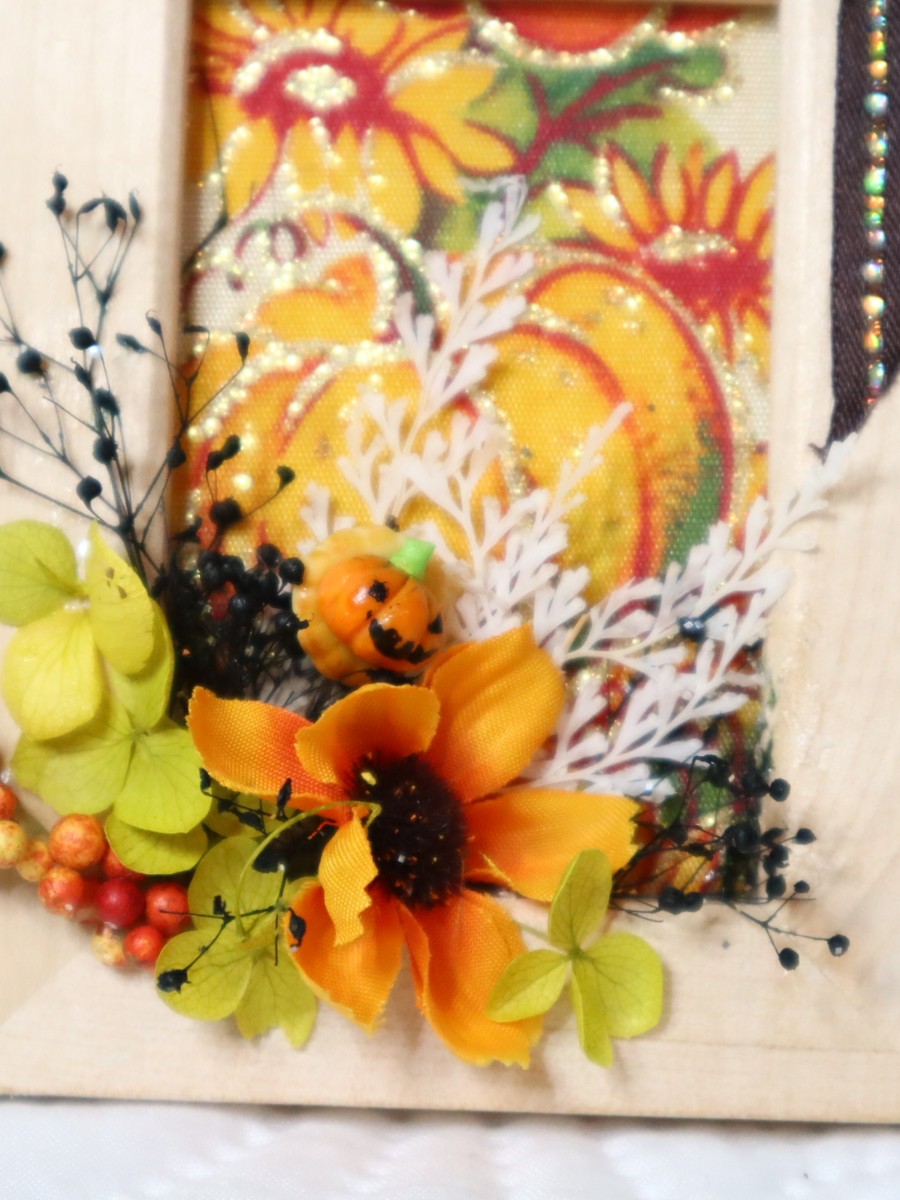 ミニフレームを秋の花で飾ったハロウィンフレームです。