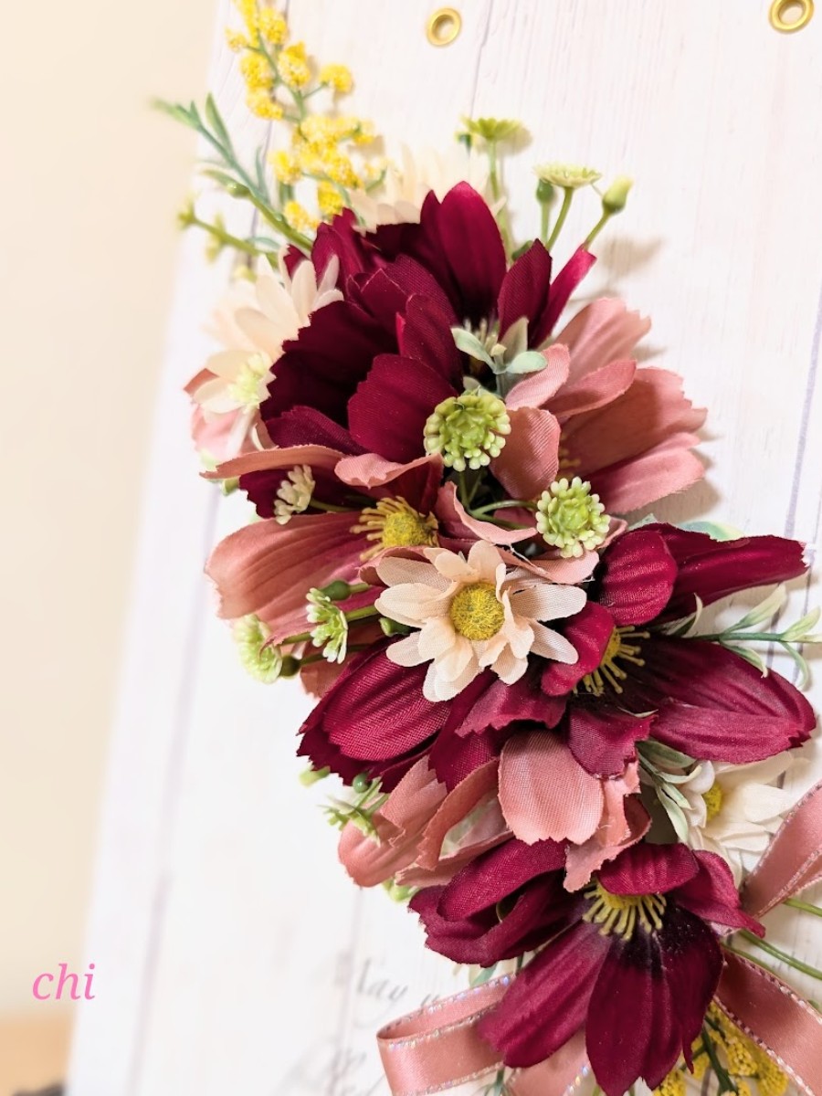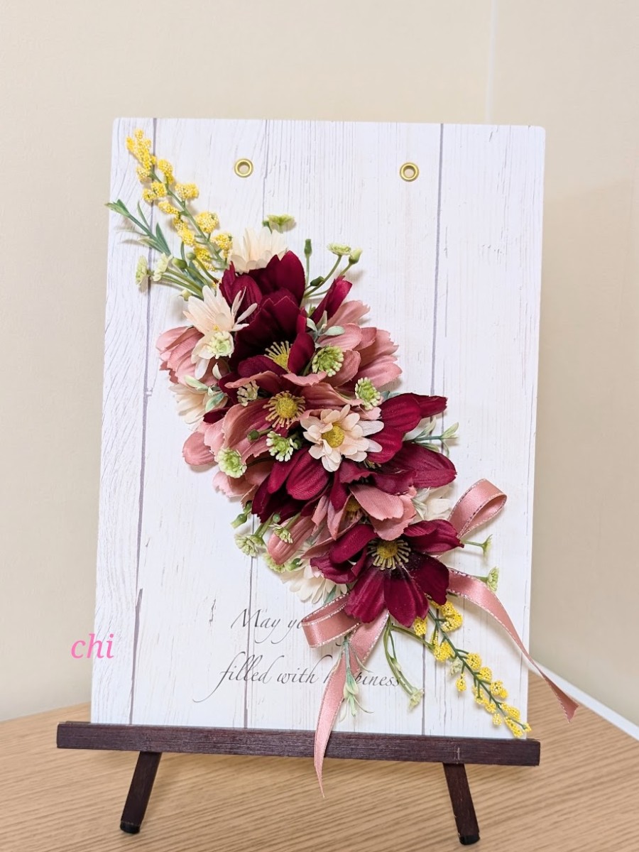 赤とピンクのコスモスを中心にボードにアレンジしました。