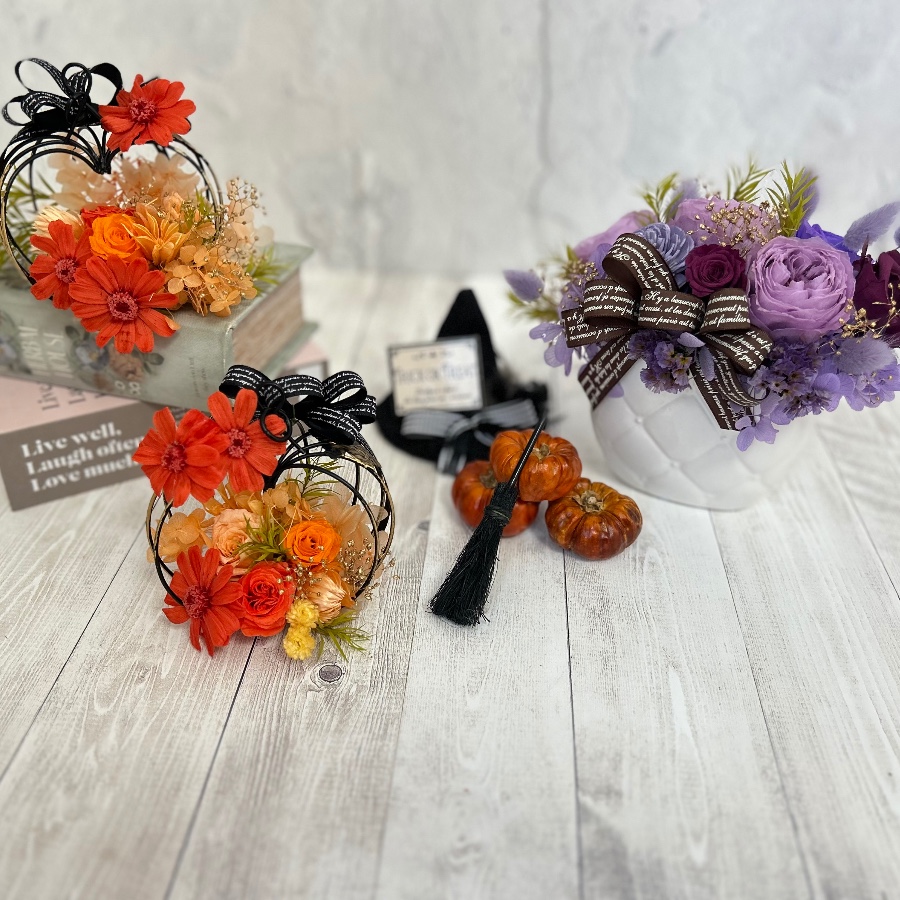 プリザーブドフラワーで定番のジャック・オー・ランタンと魔女をイメージしたアレンジメントを作りました。
