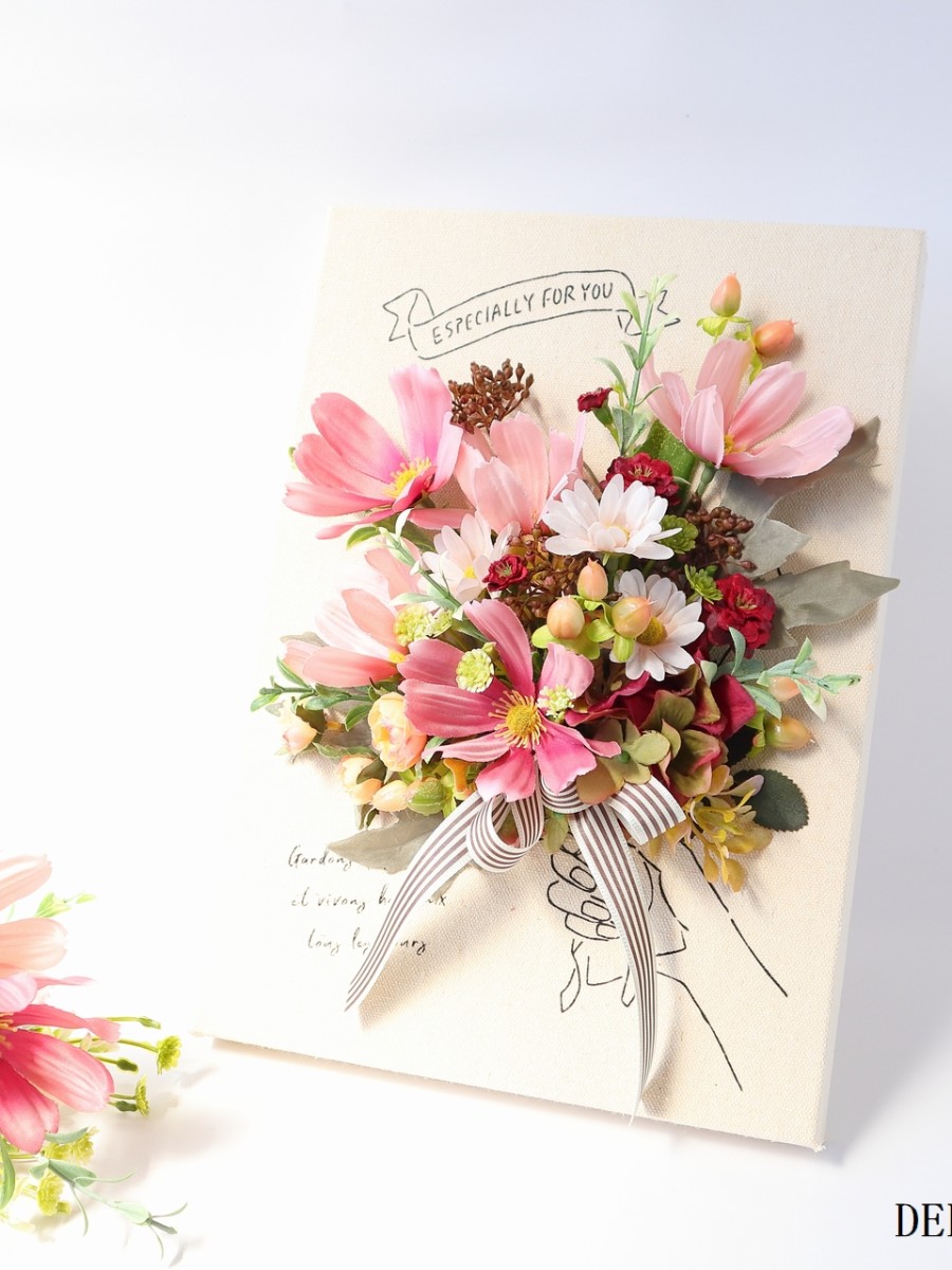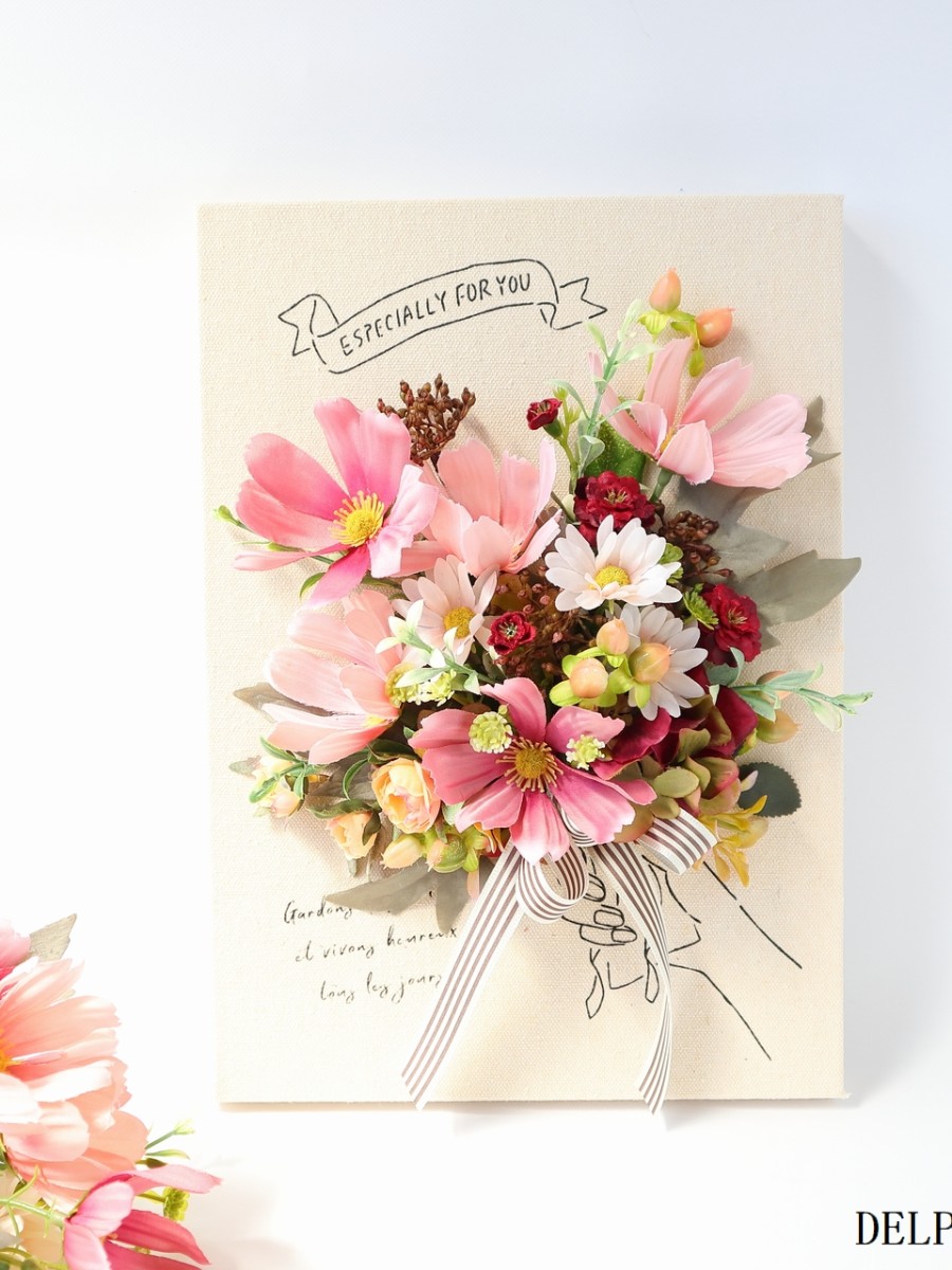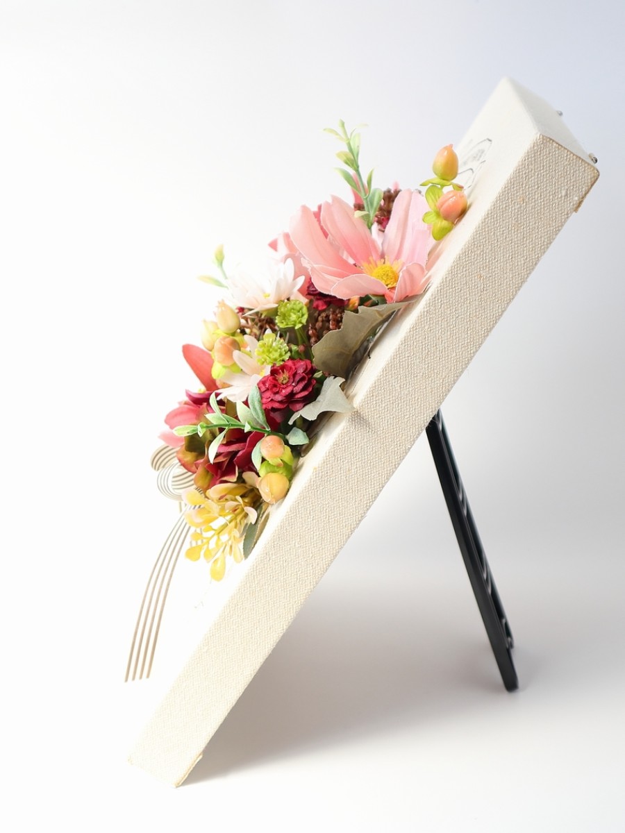 キャンバスボードにコスモスや秋色紫陽花、ミニバラなどを花束風にアレンジしました。
