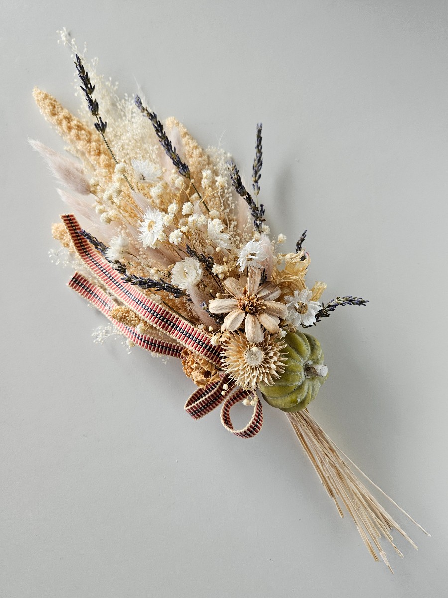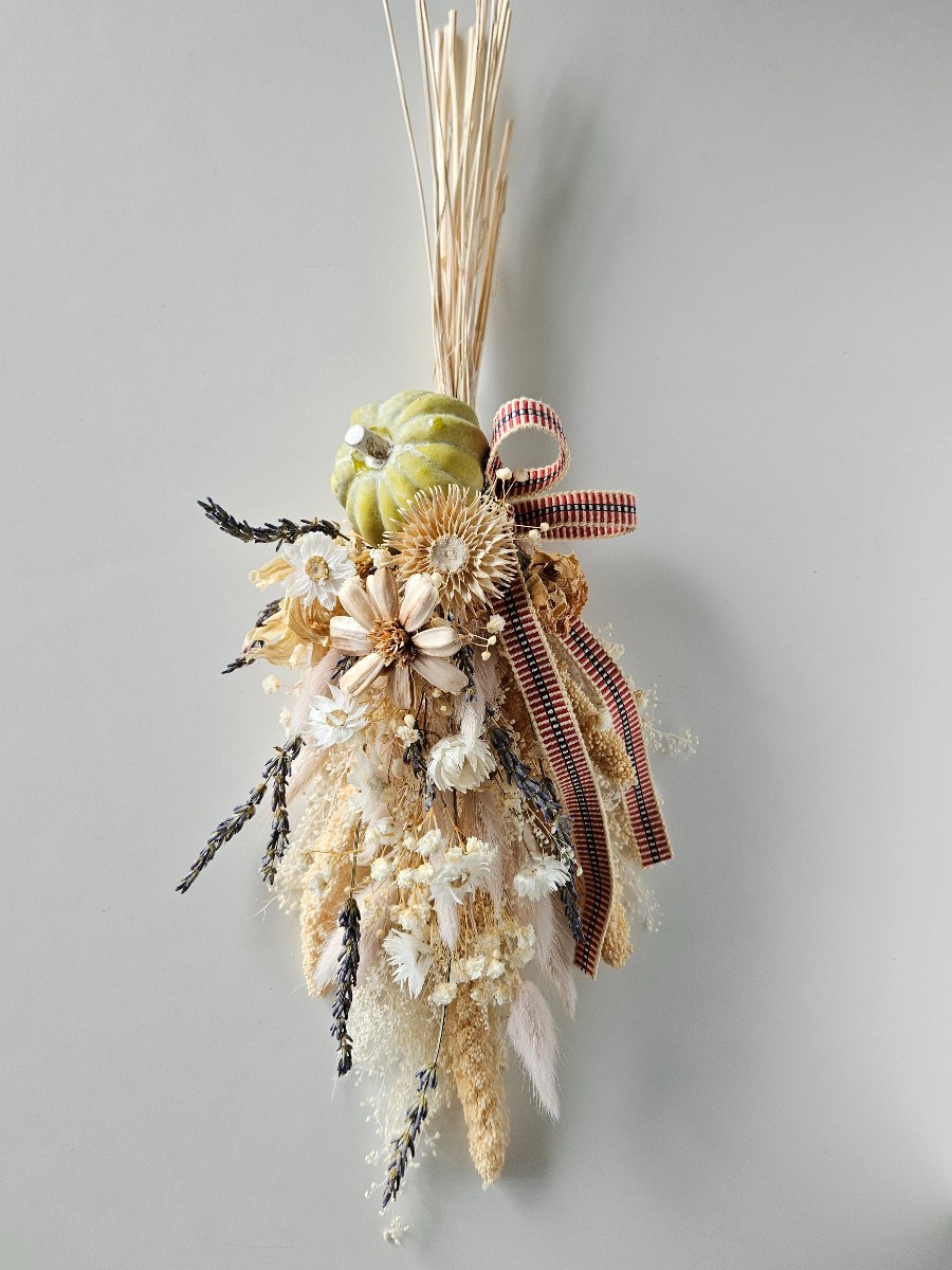 オフホワイト、優しいお色の花材をホウキに見立てて束ね、カボチャとリボンをあしらったすらりとした印象のスワッグです。