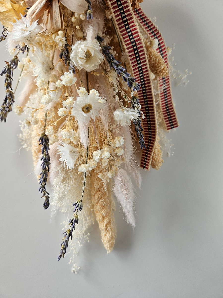 自家のバルコニーで栽培したもの、野山で採取したもの、生花店で購入した新鮮な切り花など…主に家で加工したドライフラワーを使い、その季節ごとにブーケやリース、アレンジメントなどを制作しています。