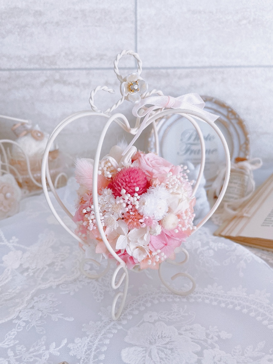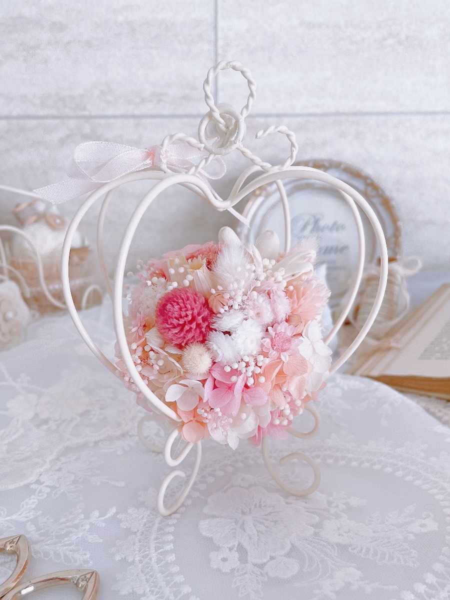 ハートのワイヤーの中にお花をたっぷり咲かせた