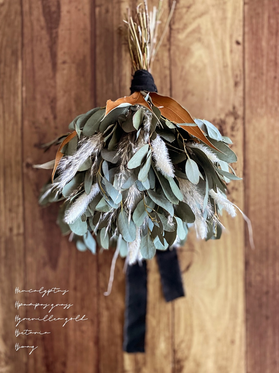 ユーカリのグリーンと白い穂を束ねました