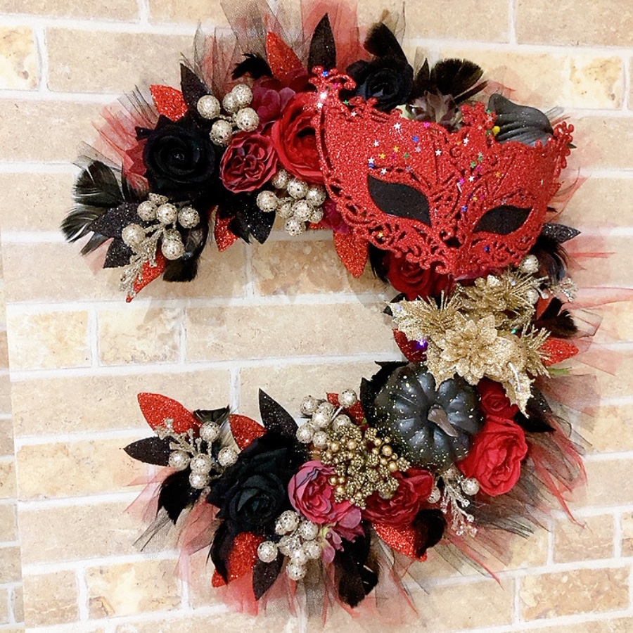 ご覧頂き誠にありがとうございますm(_ _)mオーダー頂きレッドとブラックを基調とした仮面舞踏会のイメージの豪華なハロウィンリースに仕上げました♡