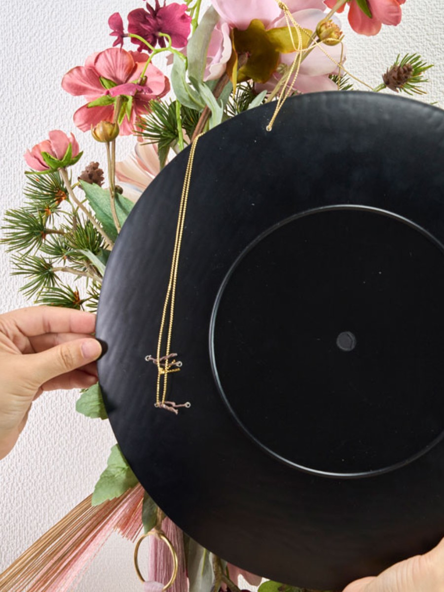 ベースにドリルで穴を開け、スワッグに組んだ花材をワイヤーで留めています。