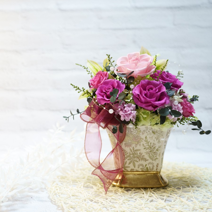 お花たちが全面を向いており、落ち着いた色合いが記念日のギフトとしてもオススメです。