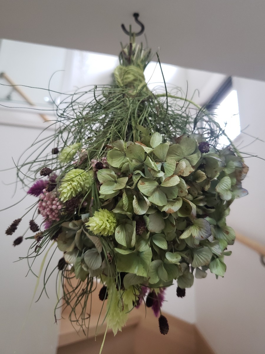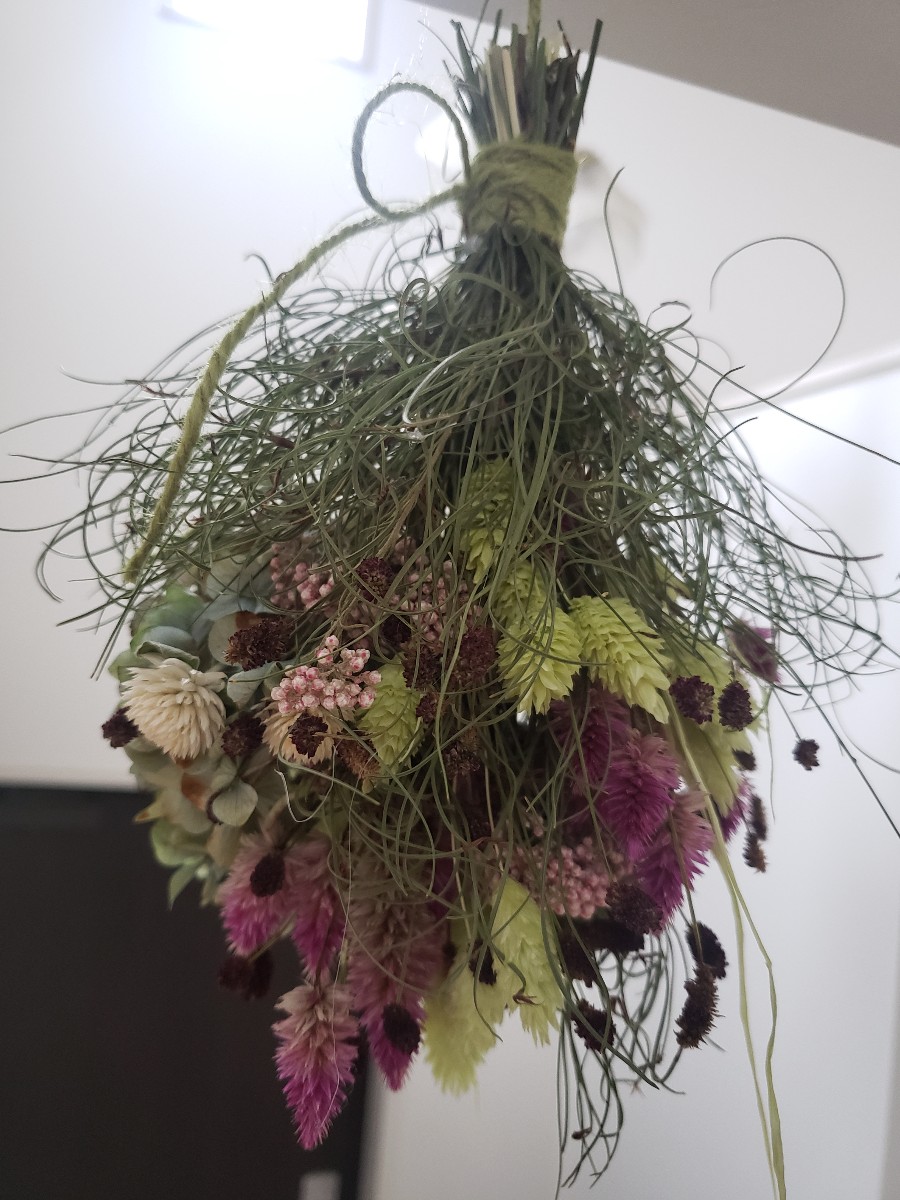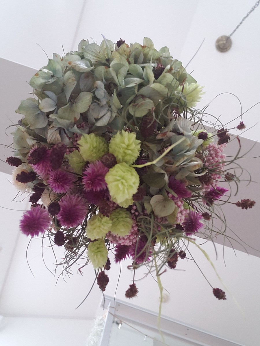 天井に吊るして飾るシーリングスワッグを作りました。どこから見てもきれいに見えるように意識しました。ゴアナクロウを入れることで軽く優しい感じを加えることができました。