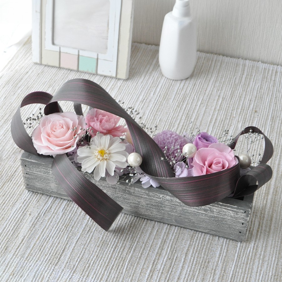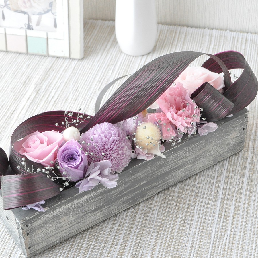 リーフリボンをハランのように使った、モダンなプリザーブドフラワーのボックスアレンジです。