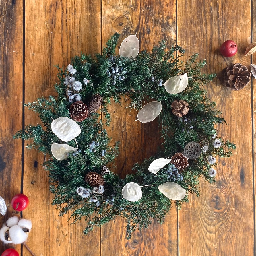 プリザーブドグリーンの針葉樹とルナリアや木の実を飾ったシックなリースです。