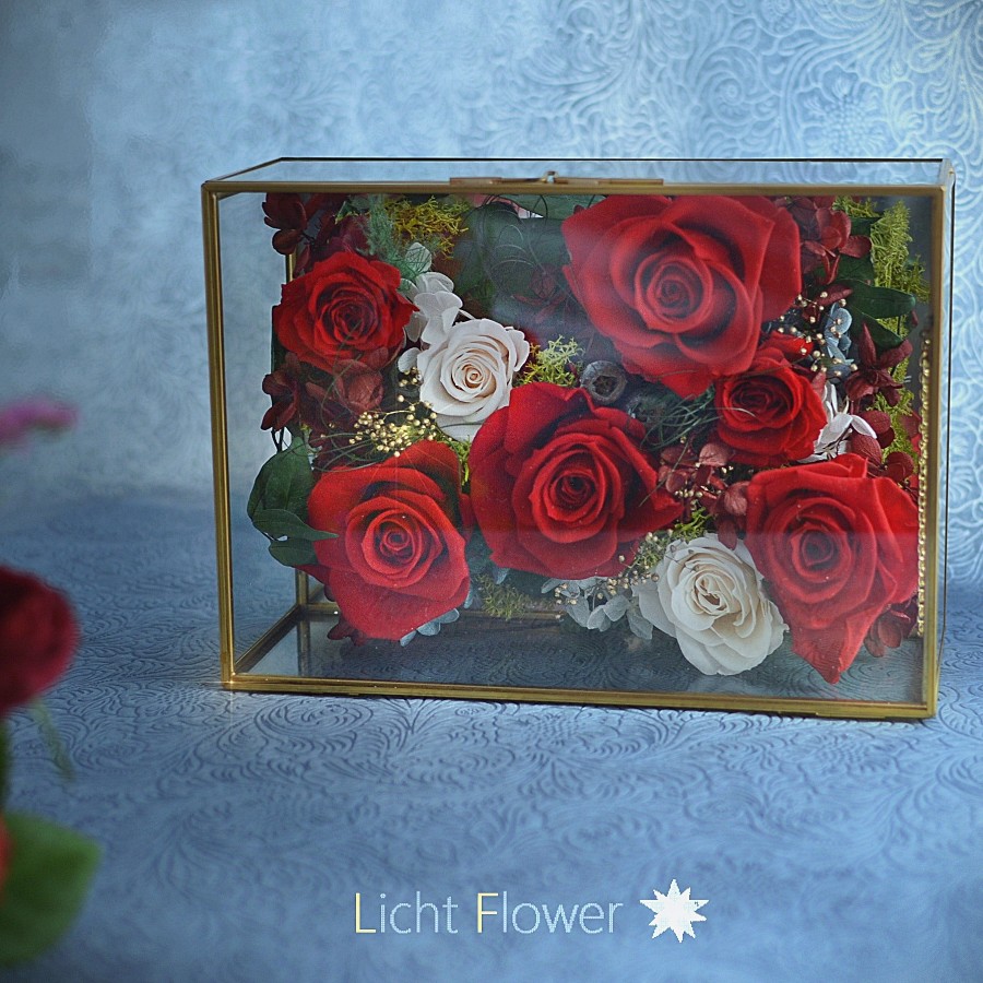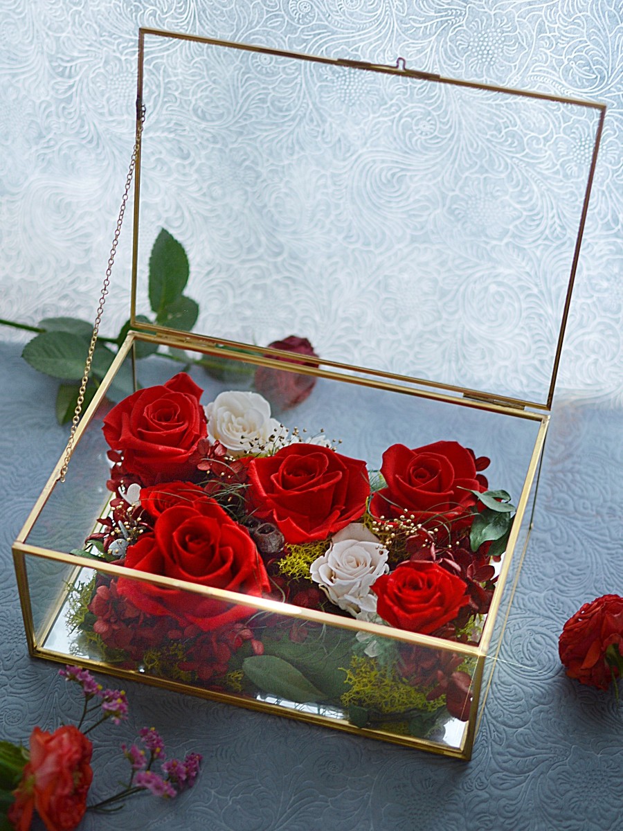 下はミラーでできた真鍮の枠のガラスケースにプリザーブドフラワーをたっぷりと使ったアレンジメント。