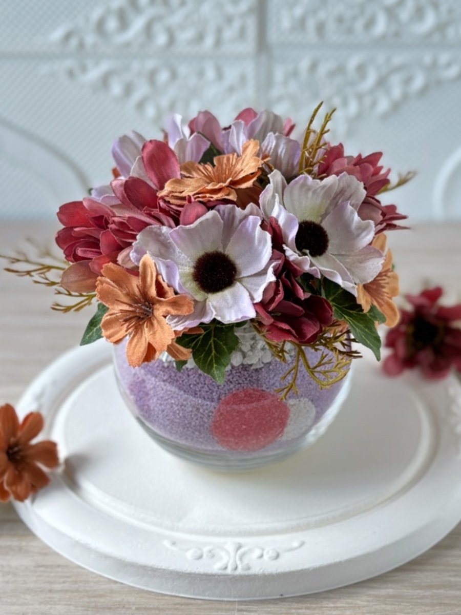 グラスサンドアートとコロンと可愛いコスモスのアレンジ