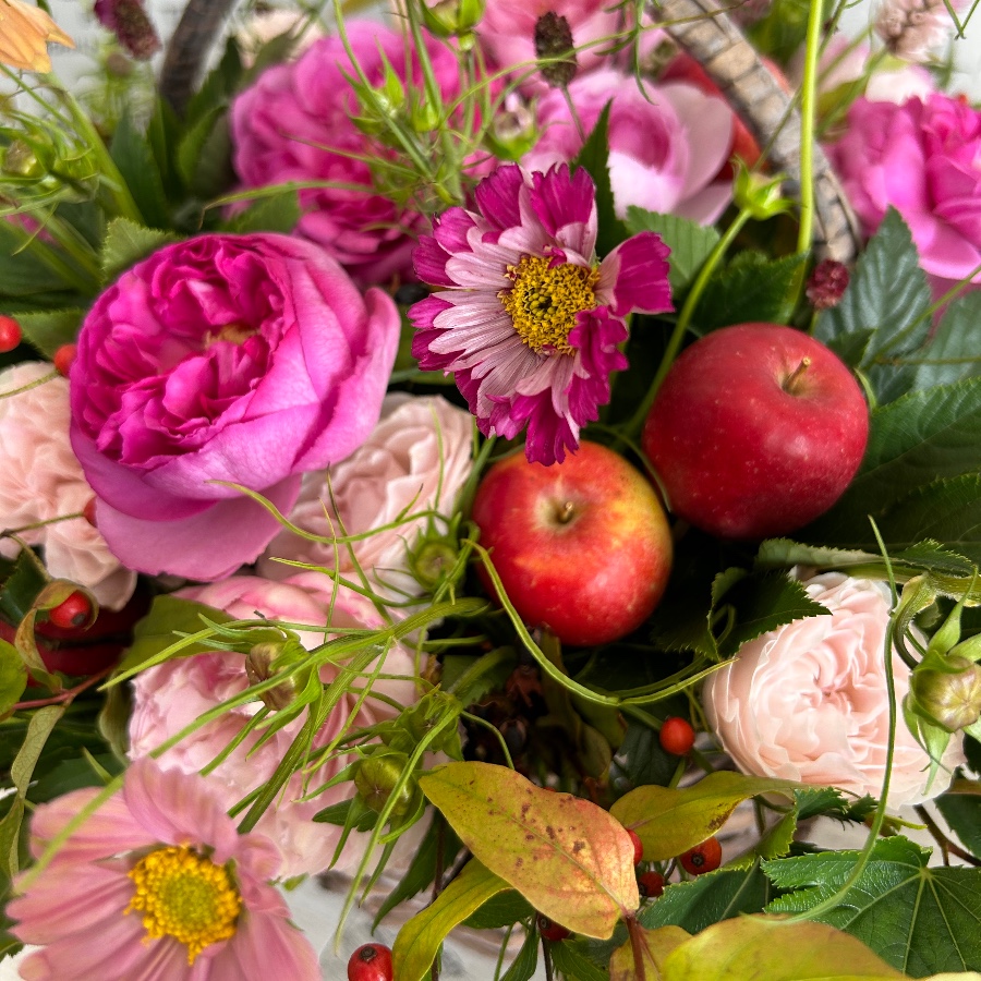 真っ赤に熟した姫リンゴと野バラも添えて畑から収穫