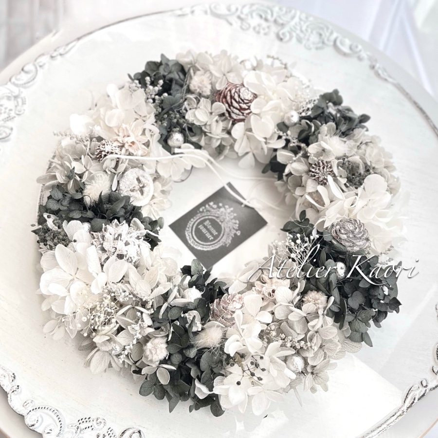 モノトーンの紫陽花グラデーションでまとめたシックな大人のウインターリースです。