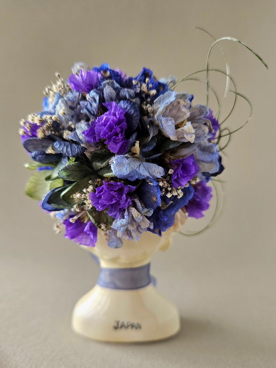ポットは日本製でアンティークな雰囲気、ドライフラワーもポットにあわせて落ち着いた雰囲気のものを選びました。