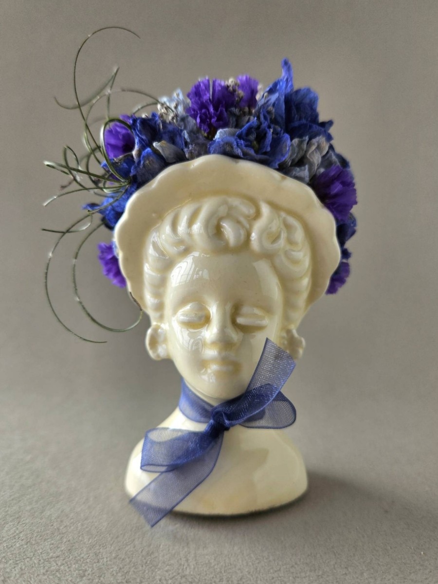 かわいらしい少女の胸像型ポットにドライフラワーをアレンジした一点ものの作品です。