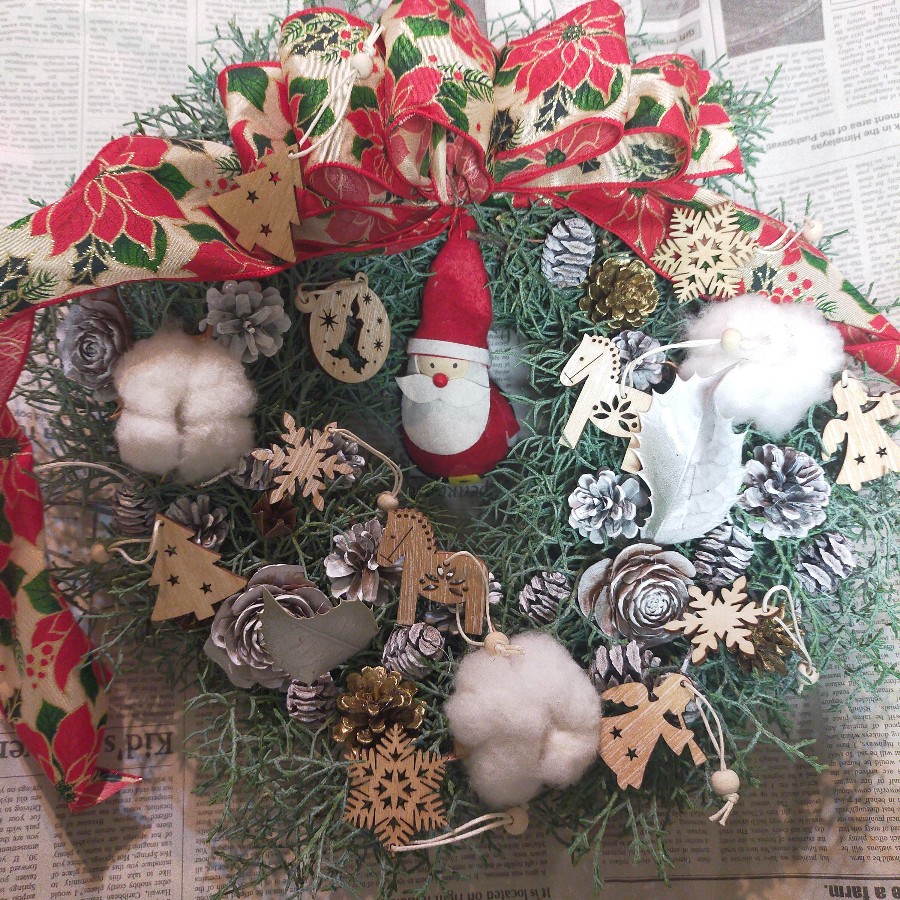 庭のブルーアイスを剪定したのでそれを使って少し早いのですが集めた木の実でクリスマスリースを作りました。