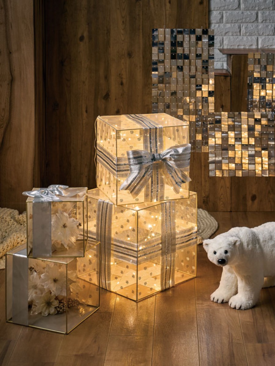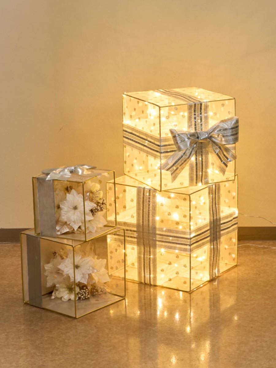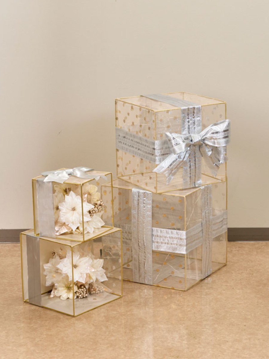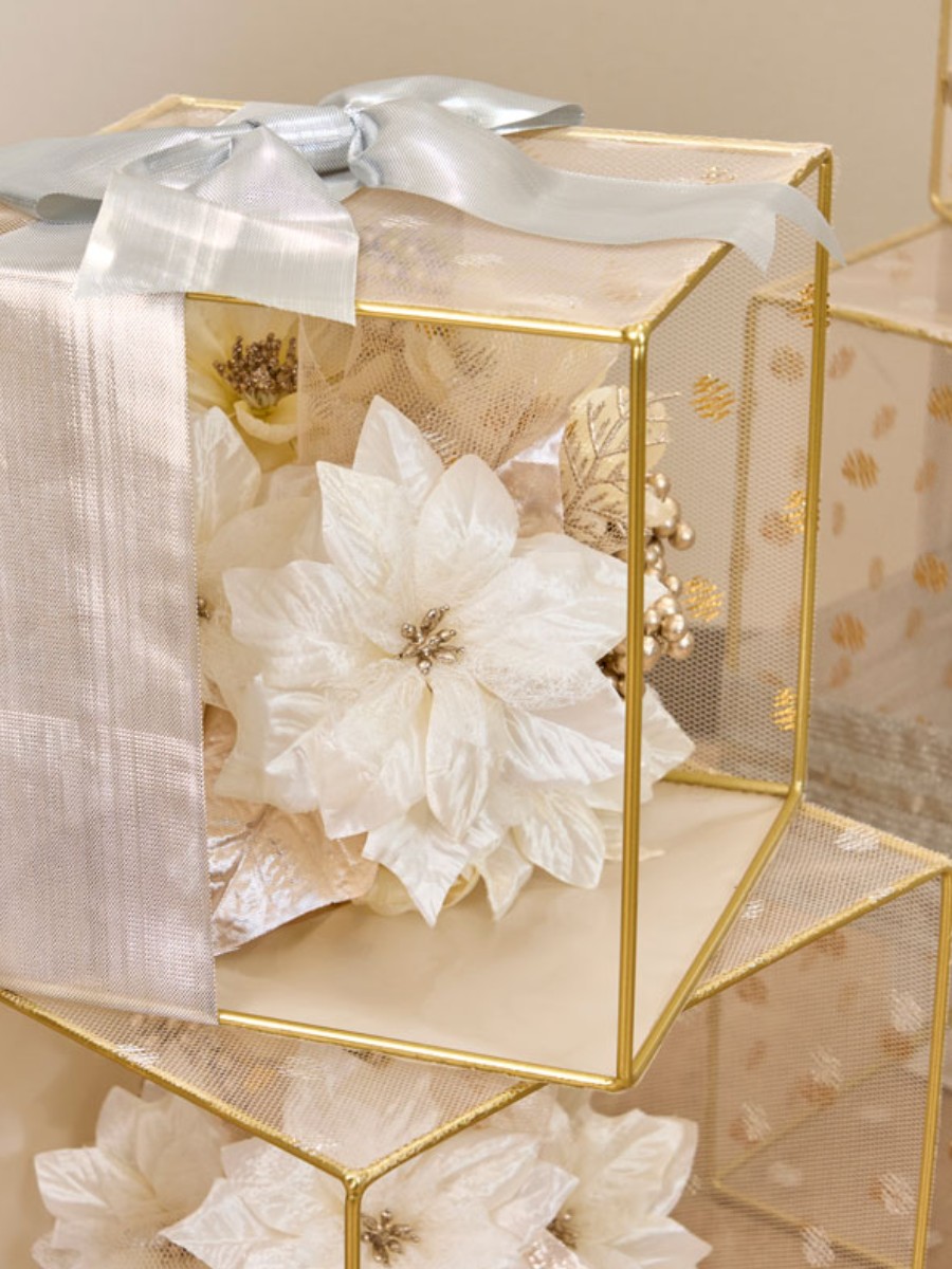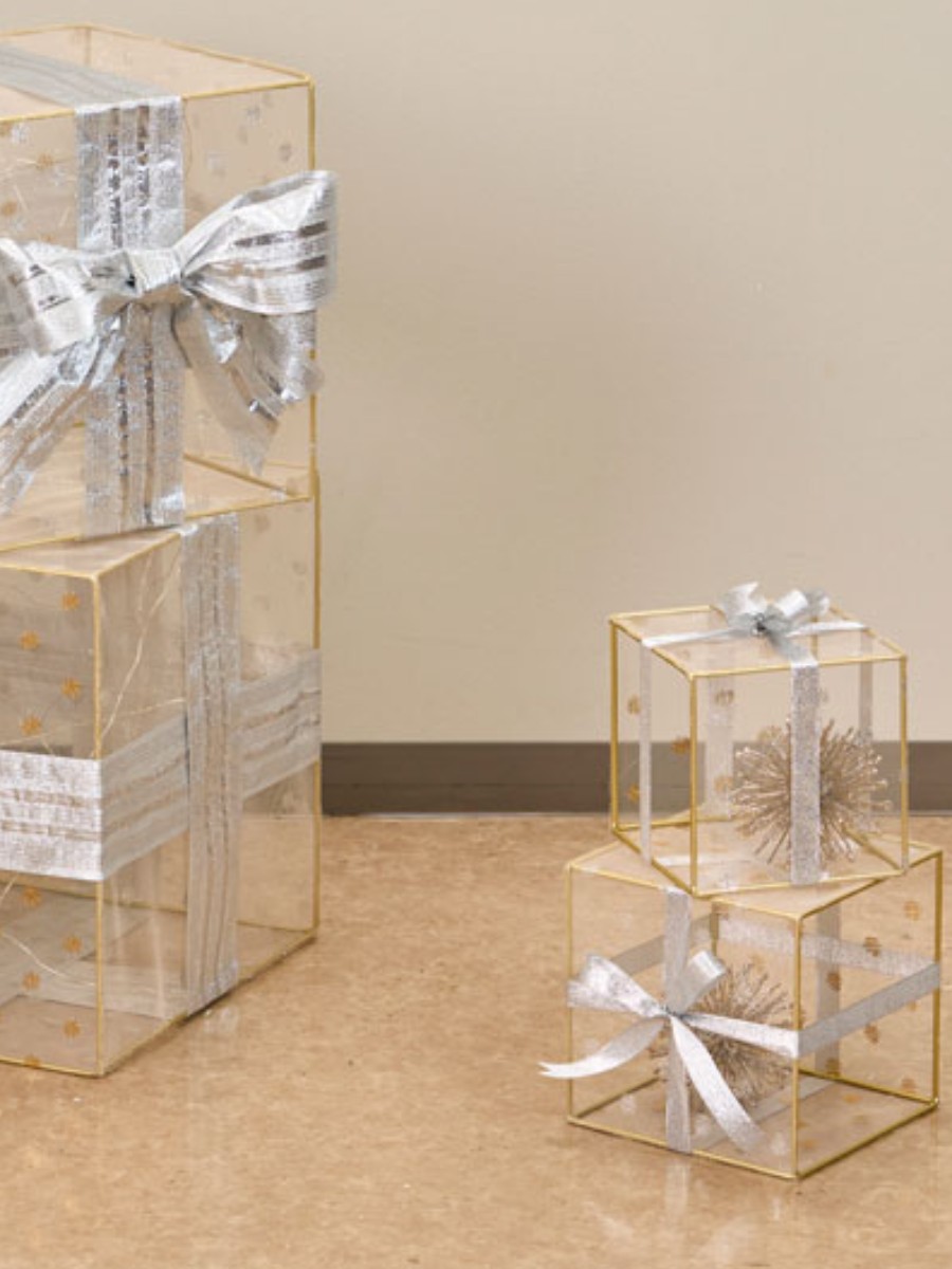 ワイヤーキューブの中にジュエリーライトを辺に渡しながら巻き留め付けた後、アドヒーシブでネット(ラッピング)を接着します。リボンを十字に貼り、作ったリボンをつけて、中に造花やアイテムを入れてギフトボックスに見立てています。