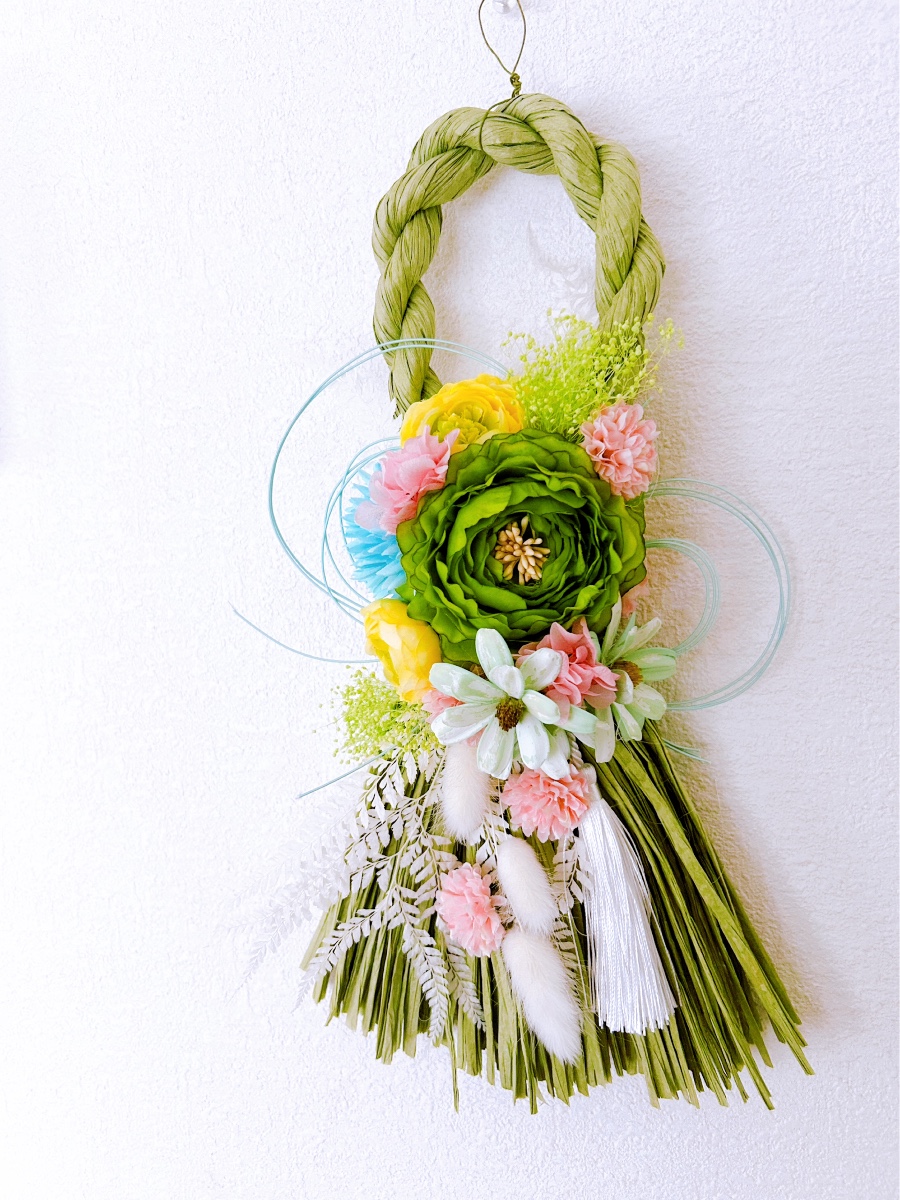 毎年オーダーしてくださるお客様から、今年は「黄緑かミントグリーン」というオーダーをいただきました。オール花どんや様の花材で作製。自分では選ぶことのない色彩で作ると、新たな発見があります。カラフルで可愛らしく仕上げました。