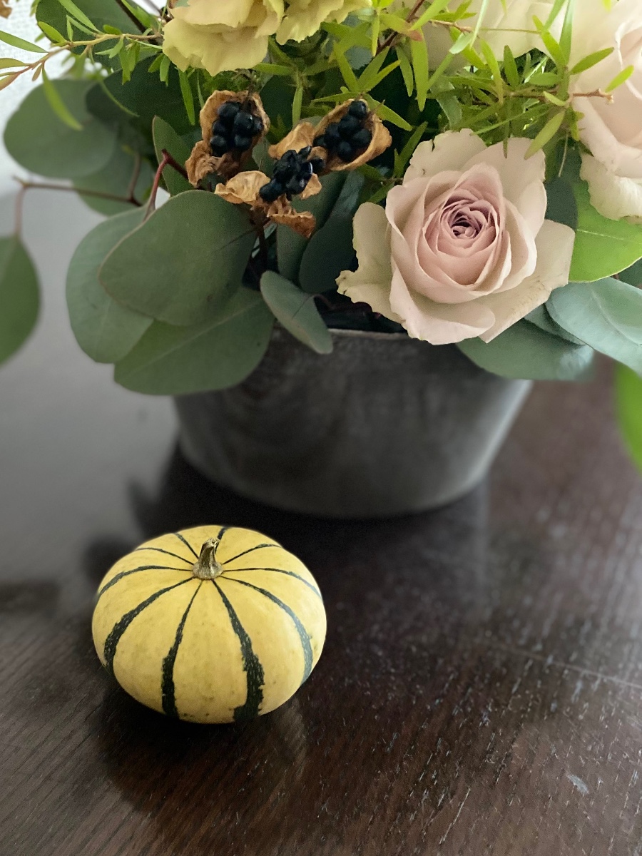 イエローのピンクッションとカーネーション、ピンクのバラに秋の実を添えて、ユーカリやメラリュウカをふわふわあしらった優しい秋のアレンジメントです。アレンジにかぼちゃをしのばせてハロウィン気分を味わいます。