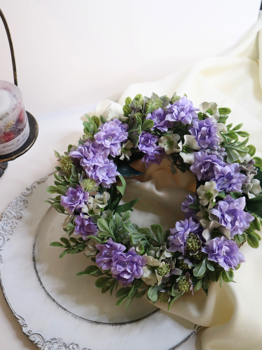 アーティフィシャルフラワーを使ったリース。優しい色合いで作りました。