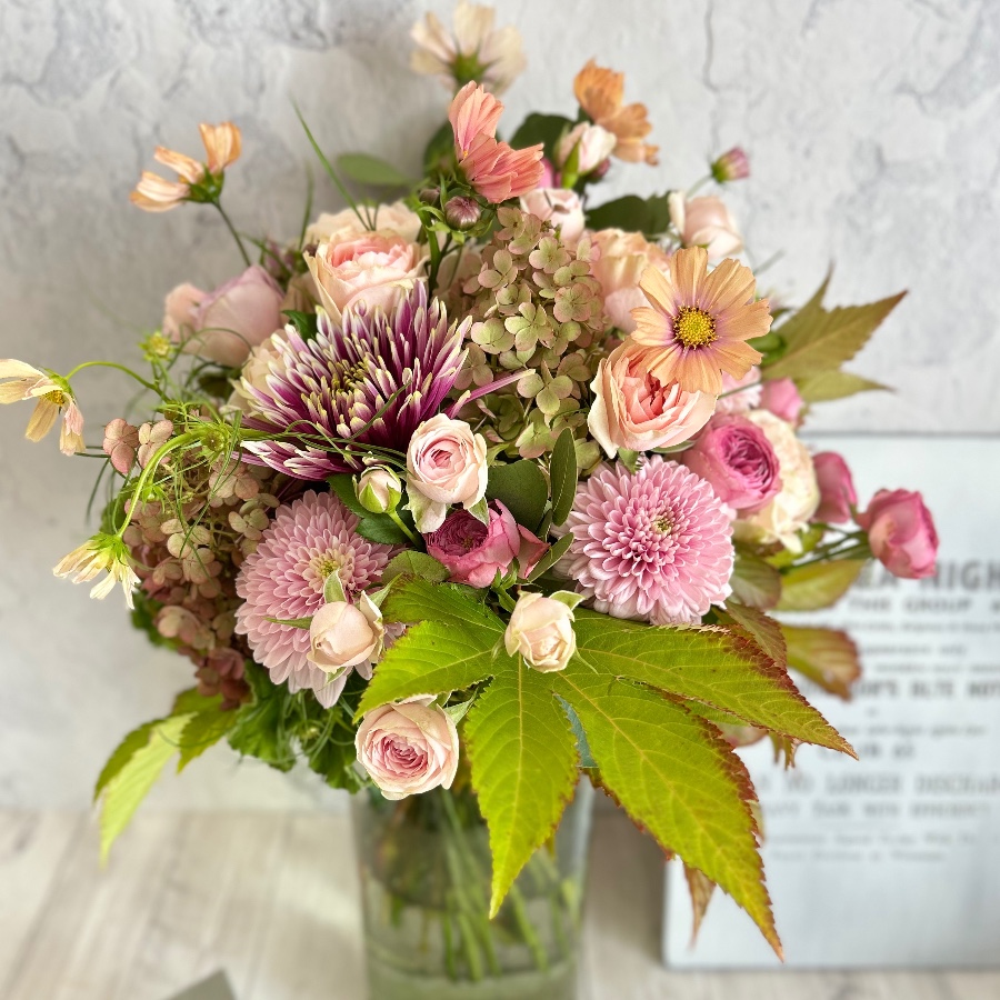 コスモスやマム、秋バラを入れてシックにまとめました。