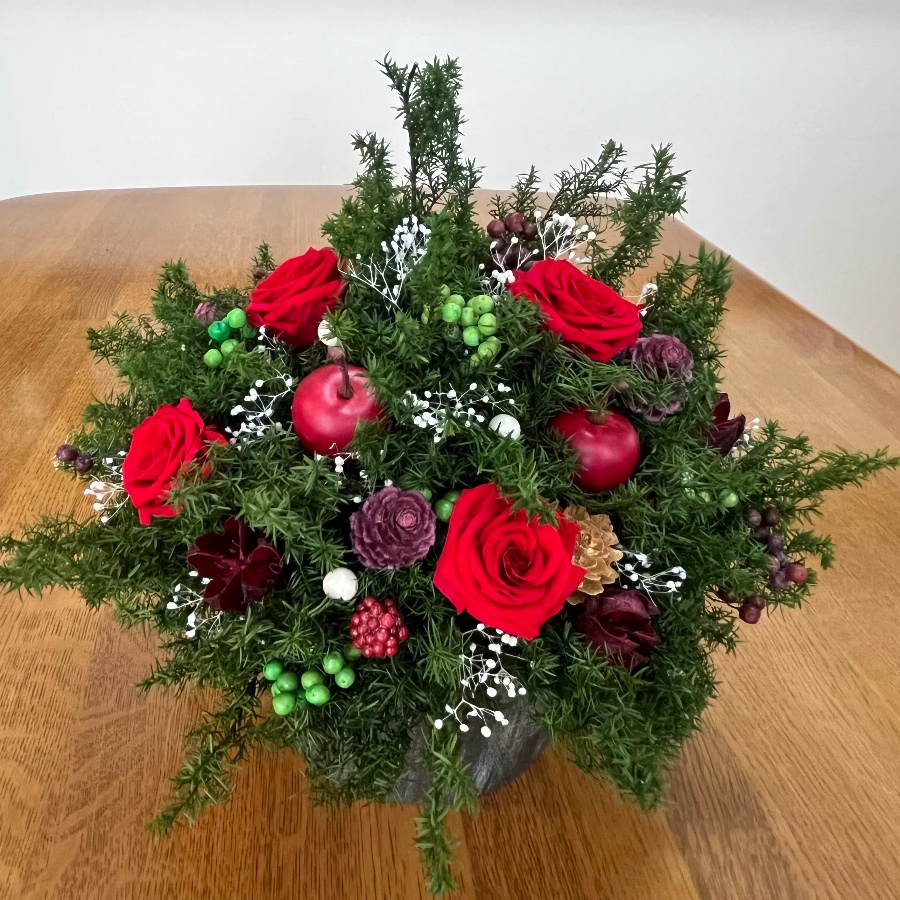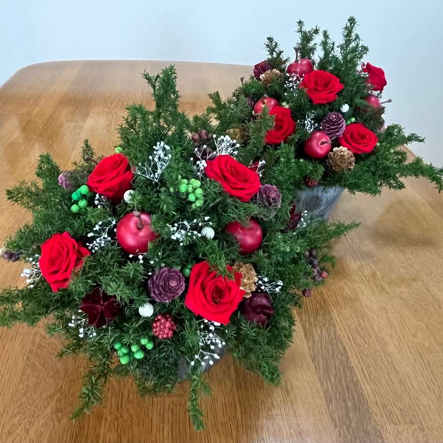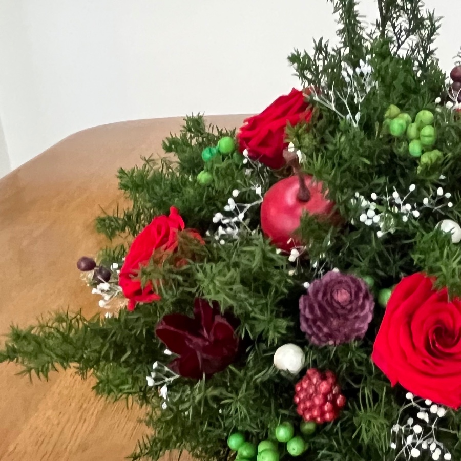 深いグリーンと赤い薔薇、実物を使用。クリスマスだけではなく冬の間飾れるようにアレンジメントを作ってみました。ピックを変えたりして春まで楽しめたらいいなと思っています。