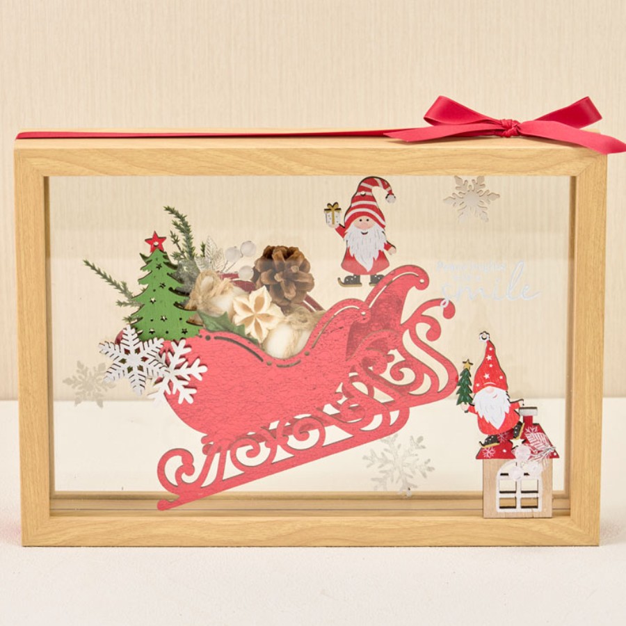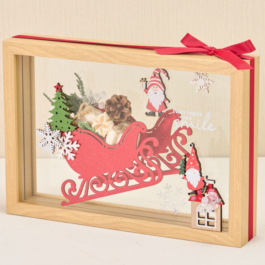 2枚のスレープレートの間にプレゼントや松かさをグルーで貼り、その厚みで留まっています。