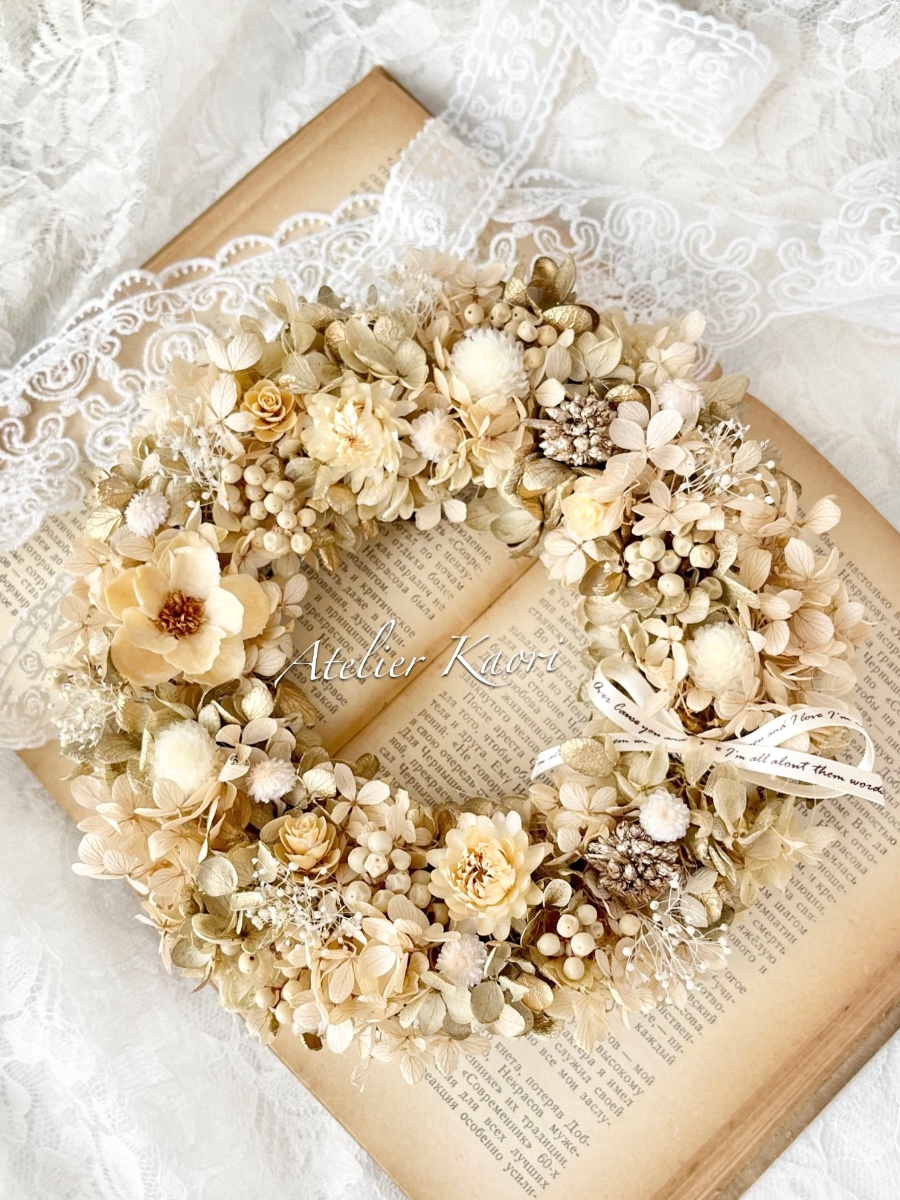 淡く輝くシャンパンゴールドの紫陽花に、木の実やペッパーベリー、ホワイト千日紅を添え、自然の温もりと季節感を表現いたしました。