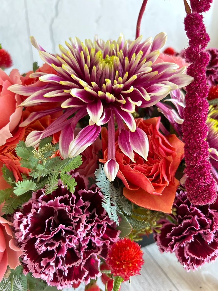 シルバーグリーンの葉物(銀葉アカシア、ポプラズベリー)もよく合います。