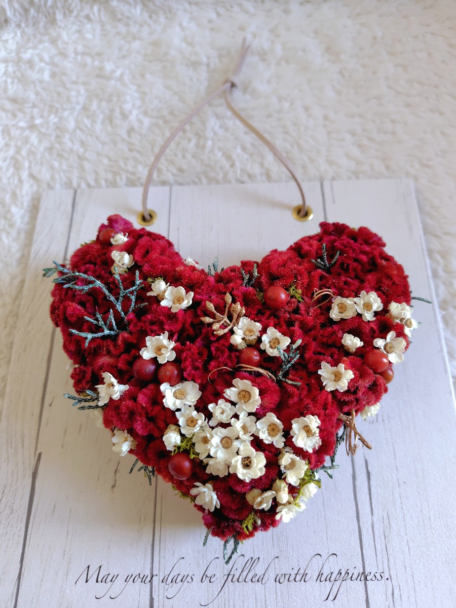 ゴージャスなイメージの真っ赤なケイトウですが、もこもこの毛糸みたいな花姿とハート型、小さな花々を添えて可憐な雰囲気に仕上げました。