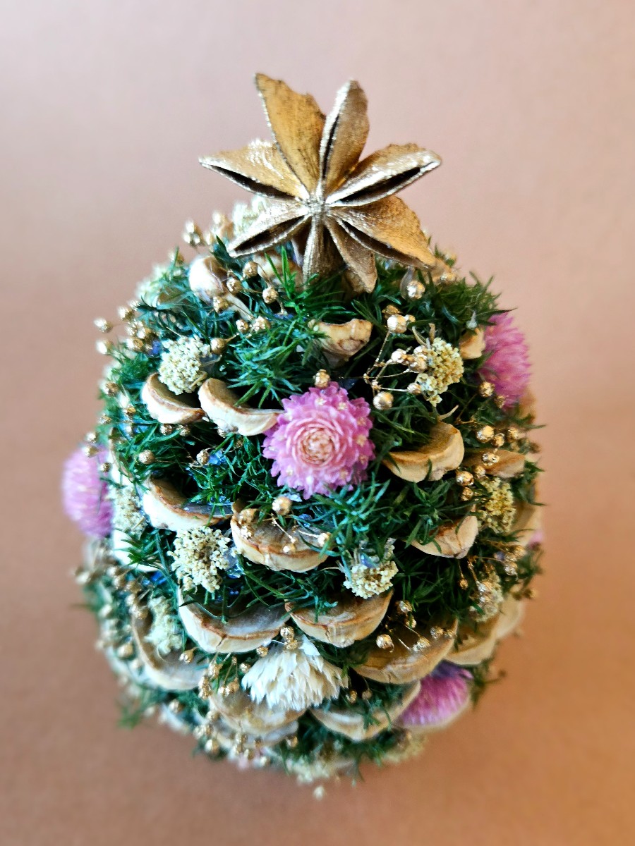 コロコロ大きなマツボックリをツリーに見立てたアレンジメント。