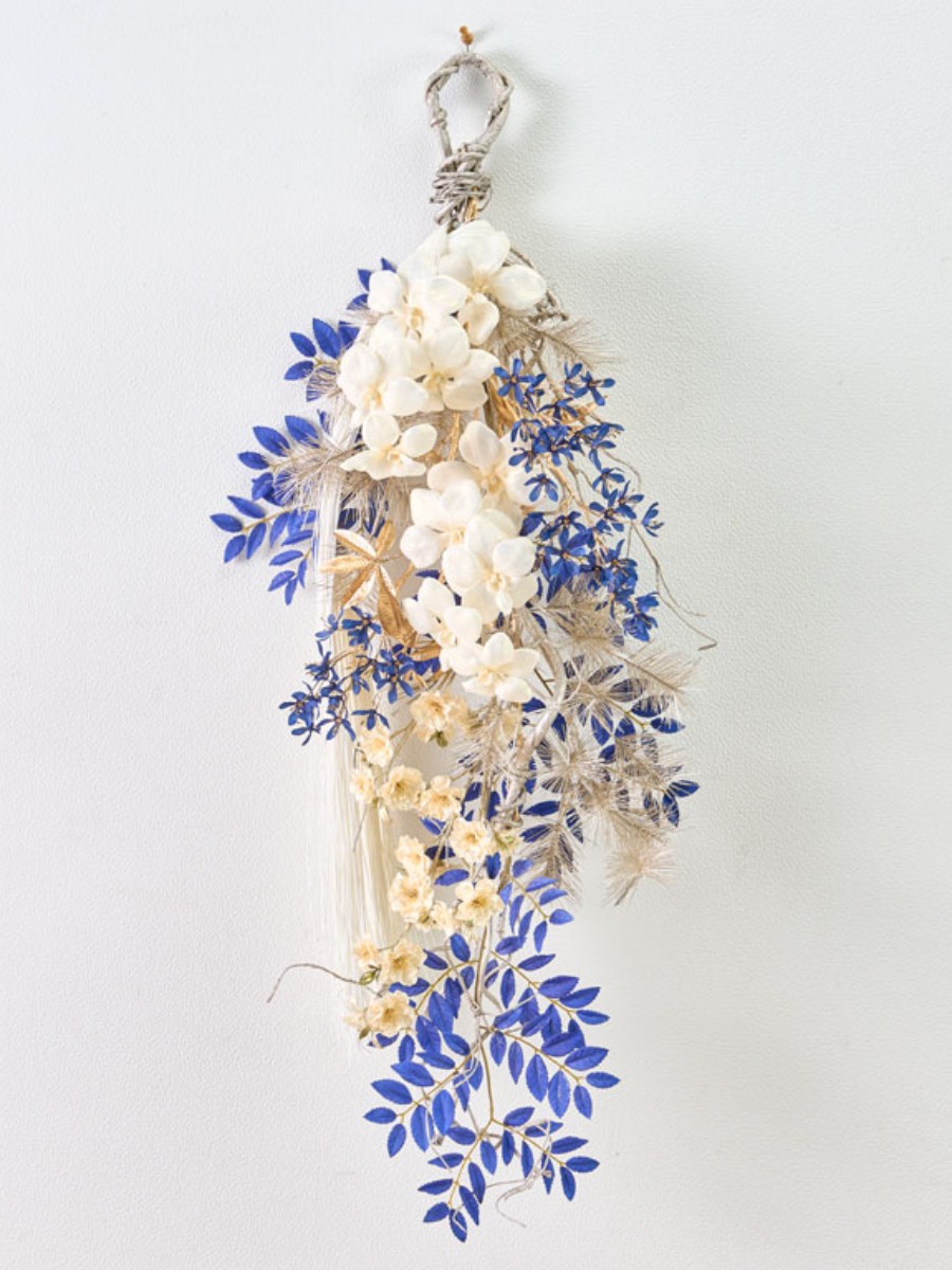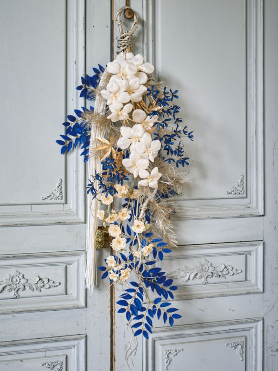 プラチナカラーの中に青を入れたモダンな色彩と煌びやかな花々の組み合わせは、いつもと違うお正月ディスプレイにぴったり。