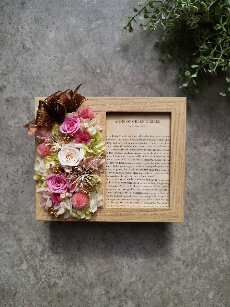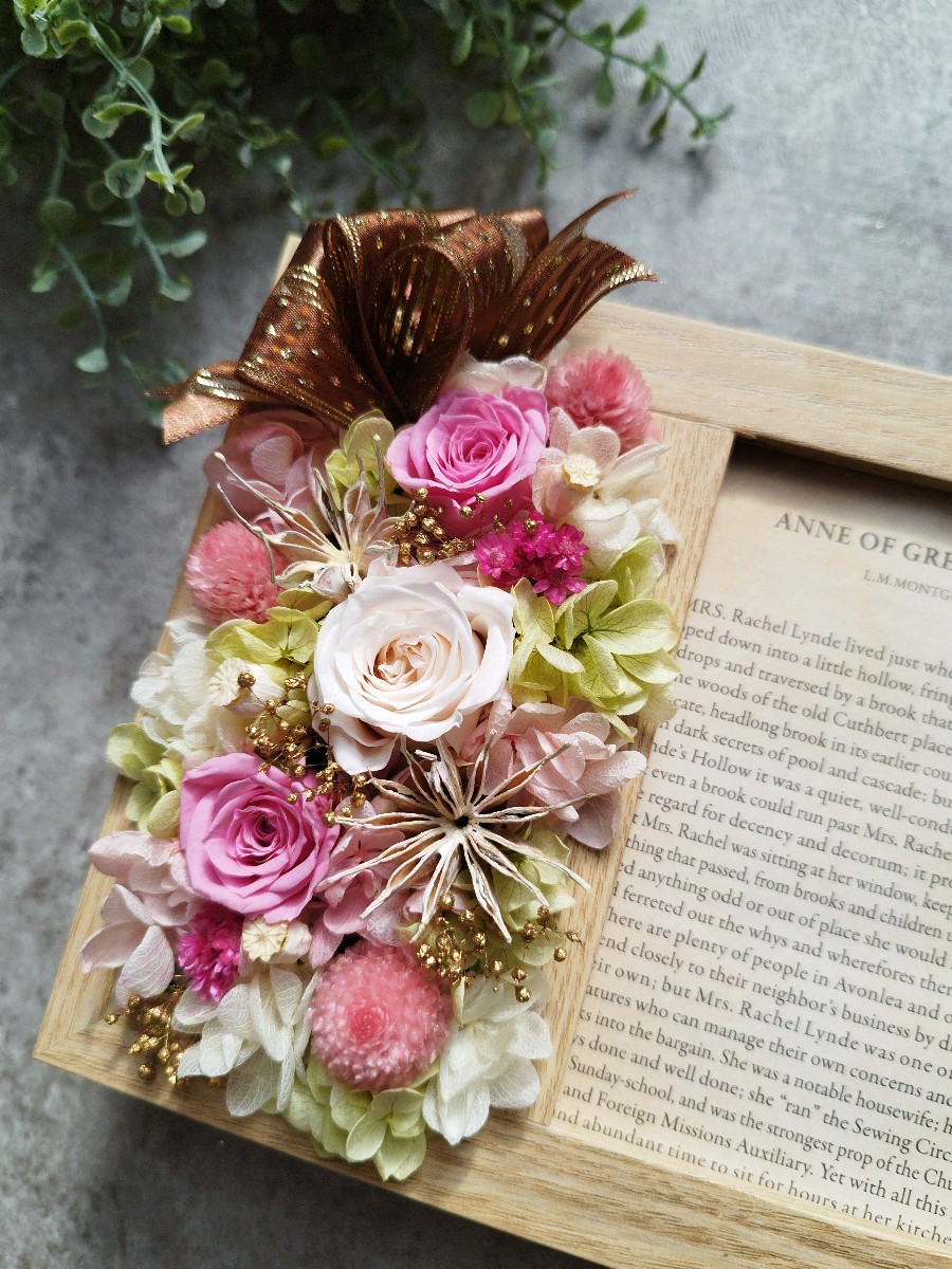 ナチュラルな、優しい雰囲気の写真立てに、ピンク・グリーン・ホワイトで可愛らしく柔らかいカラーのお花をたっぷりアレンジ。