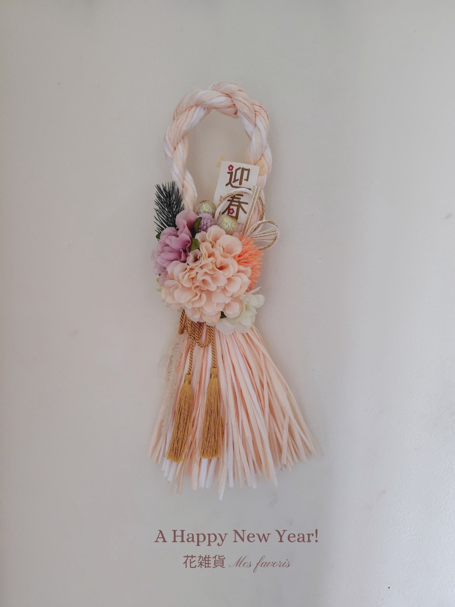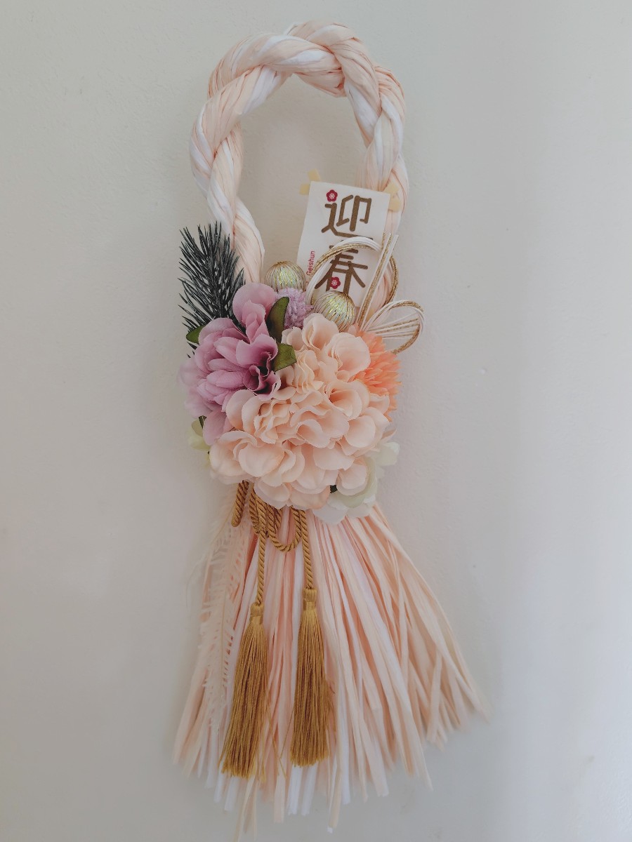 淡いオレンジ色と白の、優しい雰囲気のしめ縄土台。