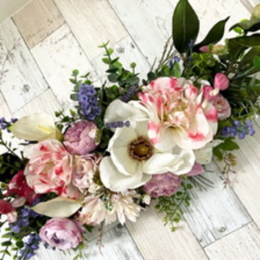 和テイストの枝花をベースに彩豊かな花材で横型のスワッグに仕上げました。
