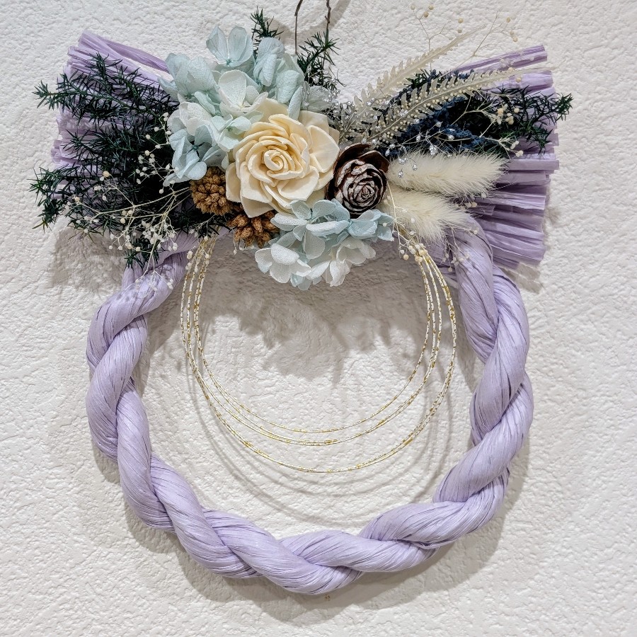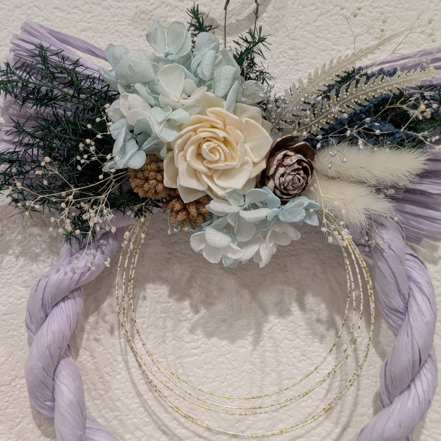 リース土台の色に合わせ、ブルー系やホワイトを基調に、温かみを持たせるためにナチュラル素材を取り入れてみました。