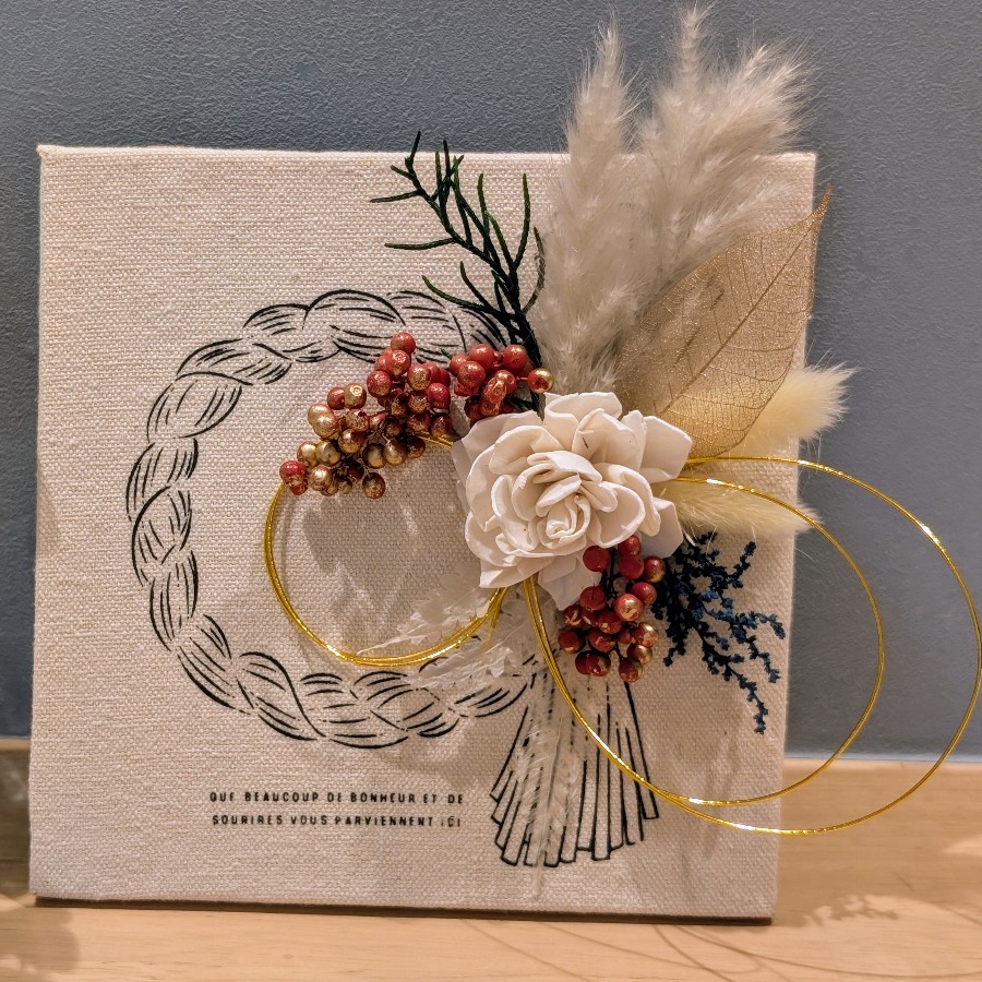 壁掛けも立て掛けて直置きも可能なキャンバスボードしめ縄です。