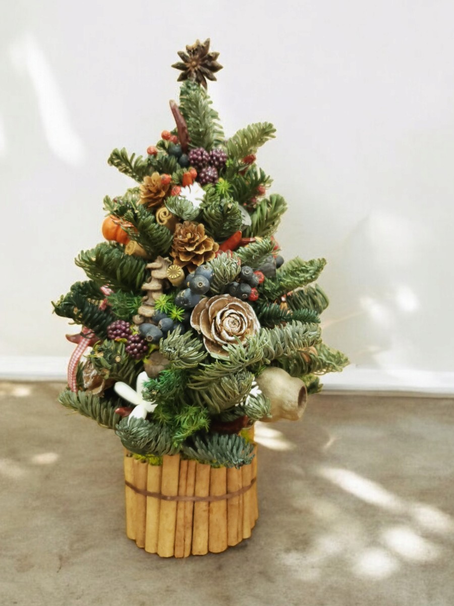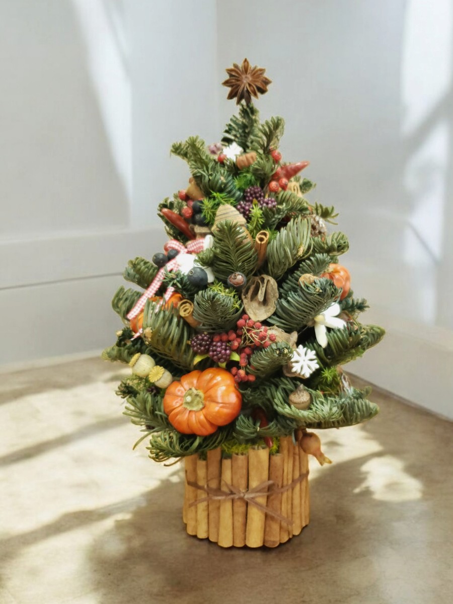 モミとヒムロスギで作ったツリーに、シナモンやクルミ、ラズベリー、アニス、カボチャのようなソラナムやたくさんの木の実。食べ物を連想させるような、賑やかで可愛らしい素材で飾り付けました♪
