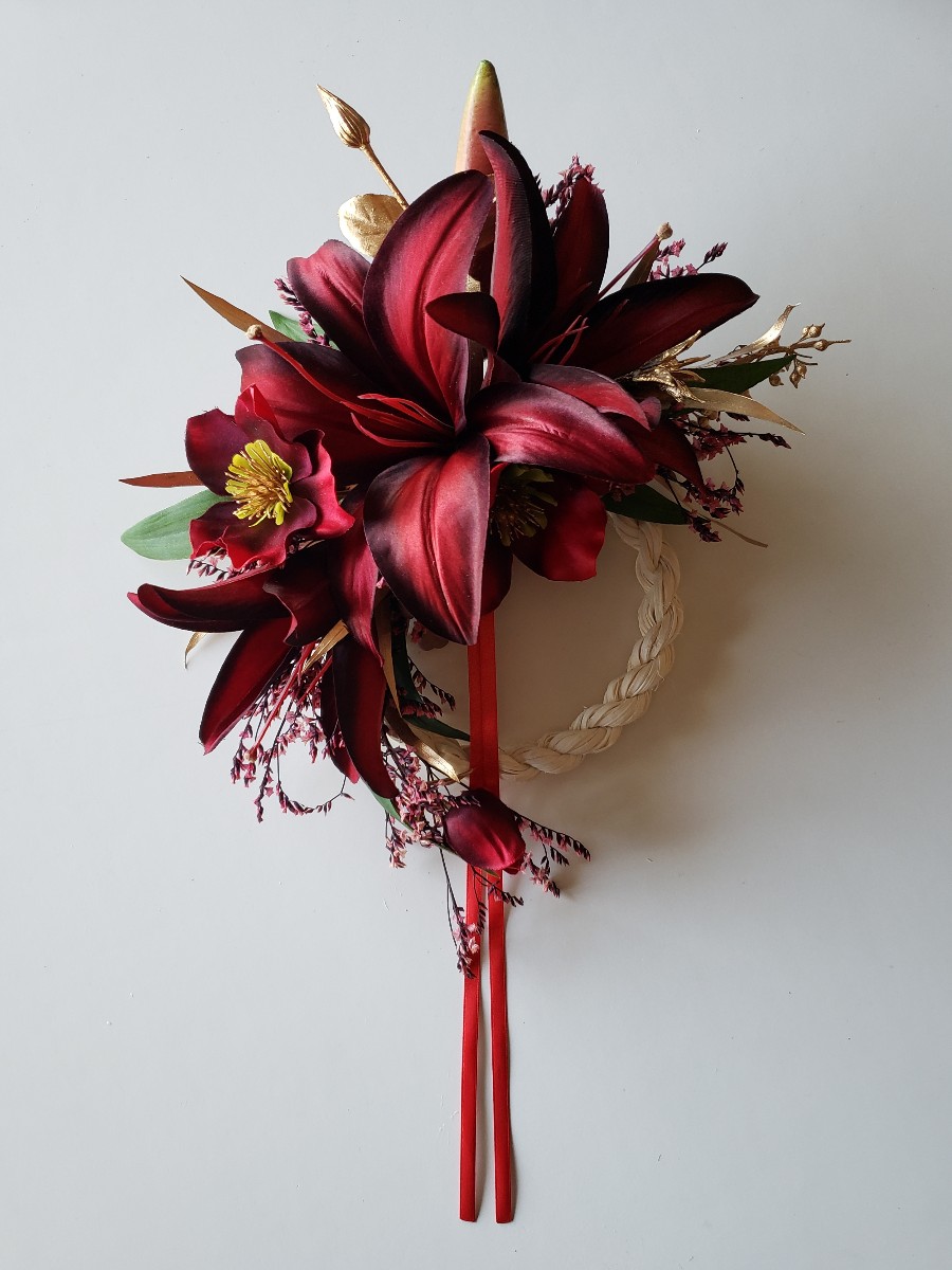 深紅のユリとアネモネを大胆にあしらったしめ縄飾り。