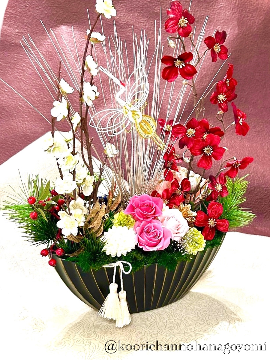 白梅や花みずきなどアーティフィシャルフラワーと真ん中にプリザのローズをあしらった和モダンのお正月アレンジです。更なる飛躍を願って水引の鶴もいます。来年もより良い年になります様に!