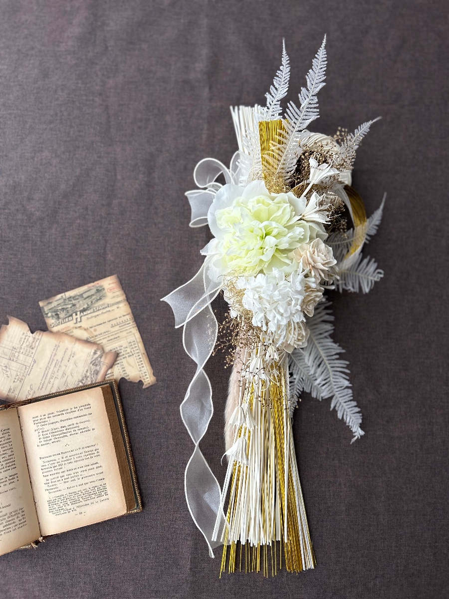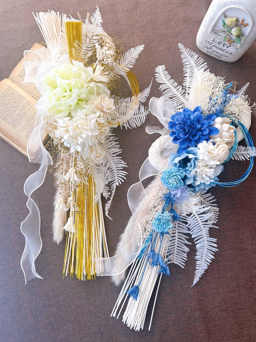 縦型ねじり2輪の白のしめ縄を使用しました。そこにゴージャスなゴールドの水引き。大輪のピオニーを中心にダリアのソラフラワーを使用し、シンプルかつゴージャスに仕上げました。