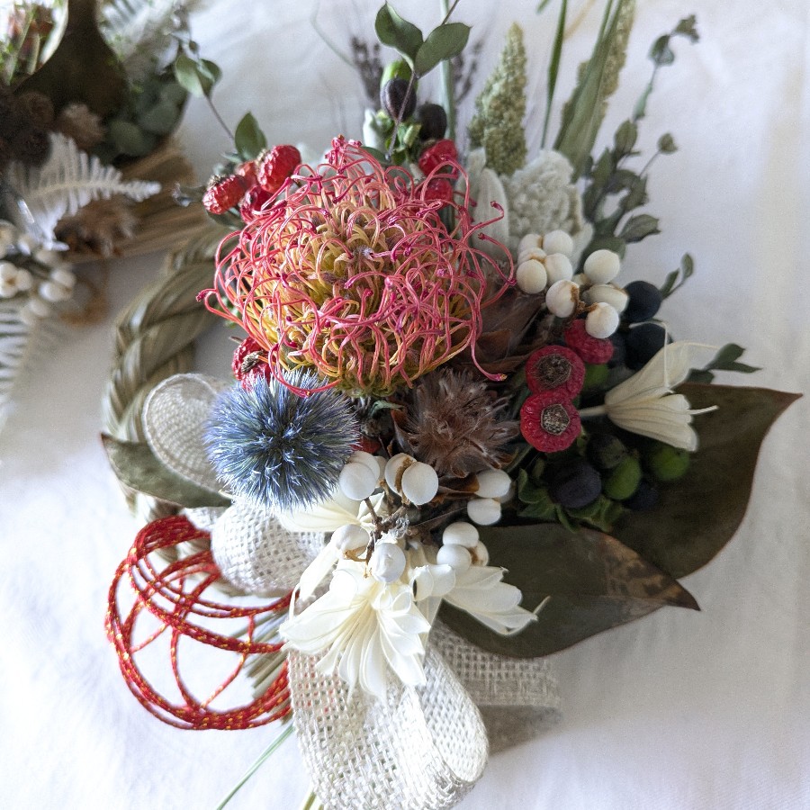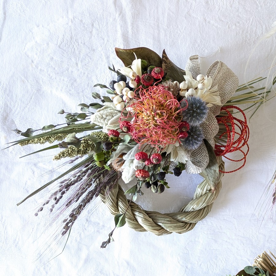 華やかなお花と紅白の実、稲などの縁起の良い植物を束ねて、稲わらリースにつけました。