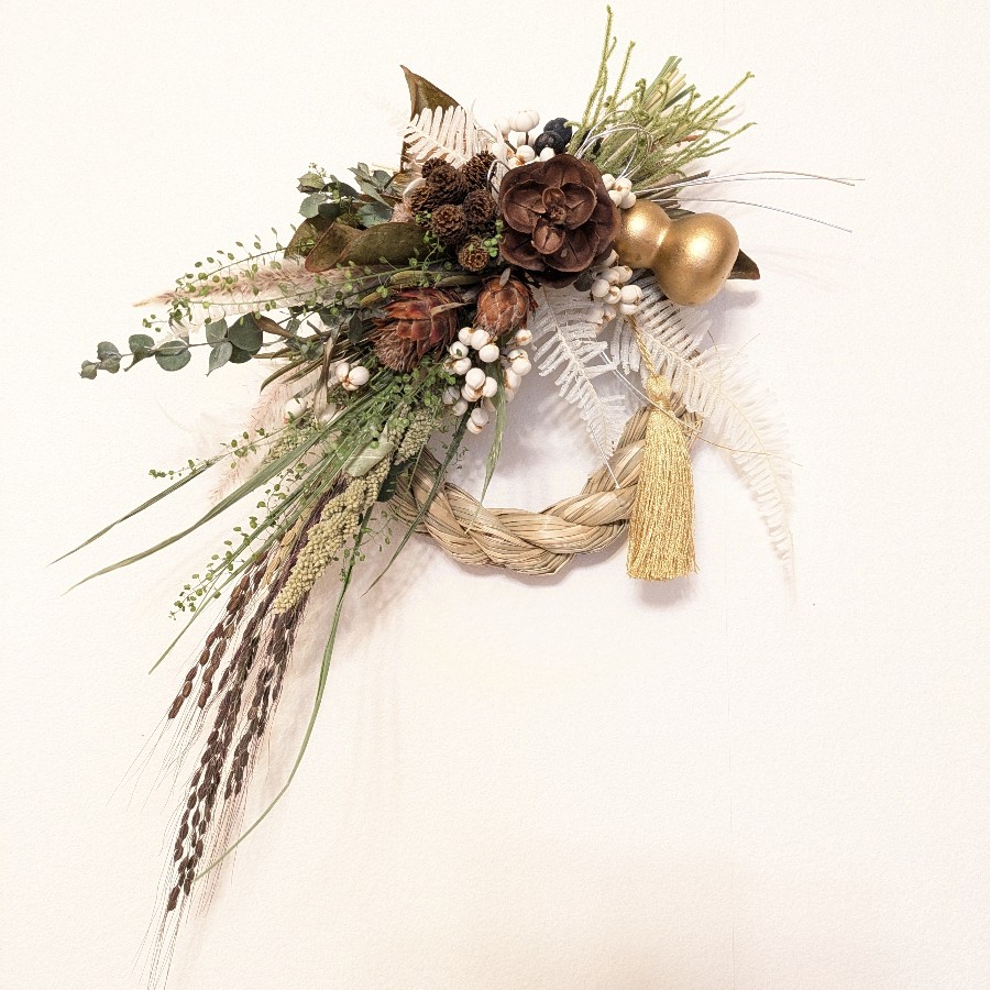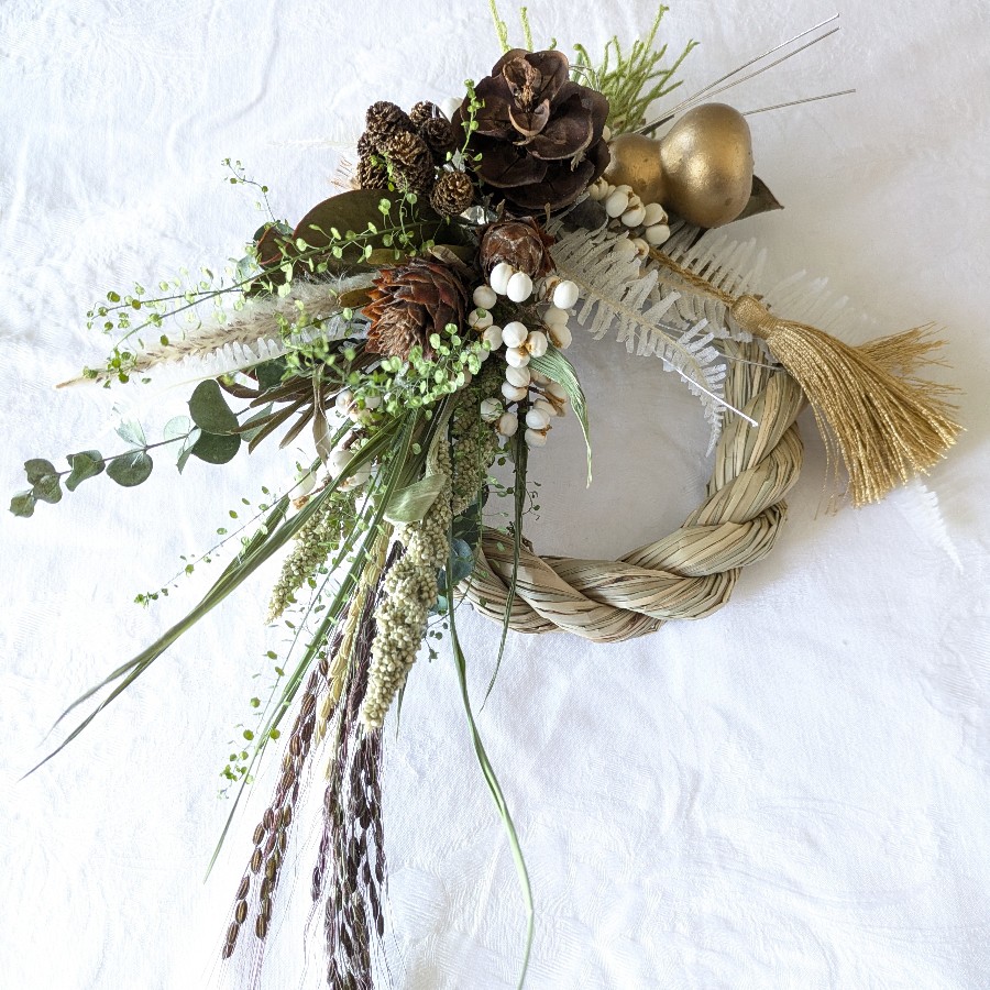 お花のような松ぼっくりを中心に、古代米やアワを流れるように束ねました。