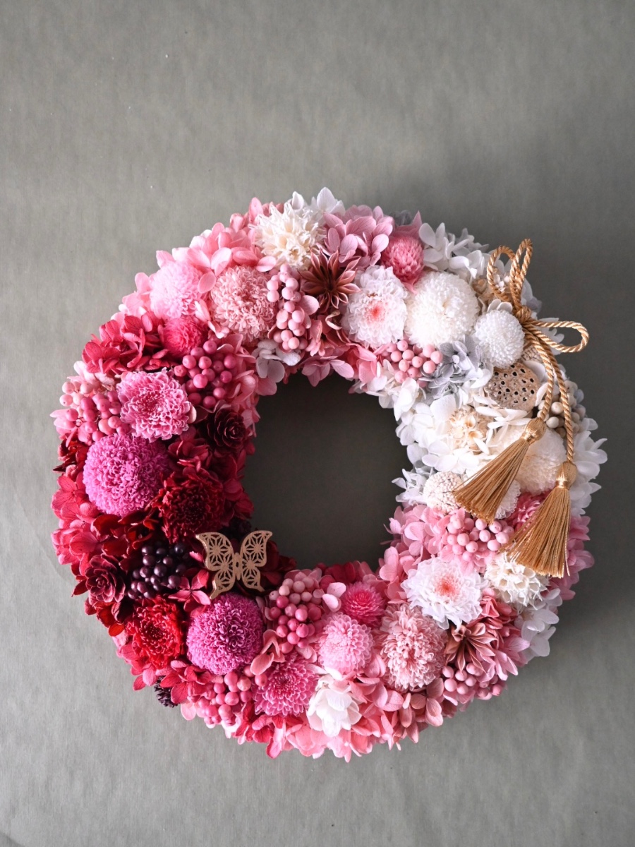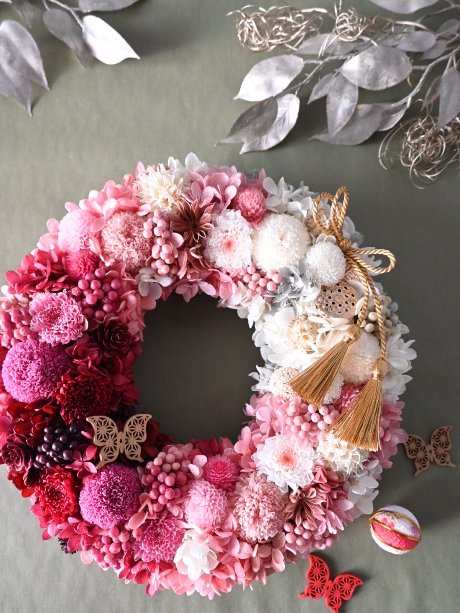 新しく迎える年が、明るく幸せに満ちあふれたものになりますように。そんな願いを込めたリースです。