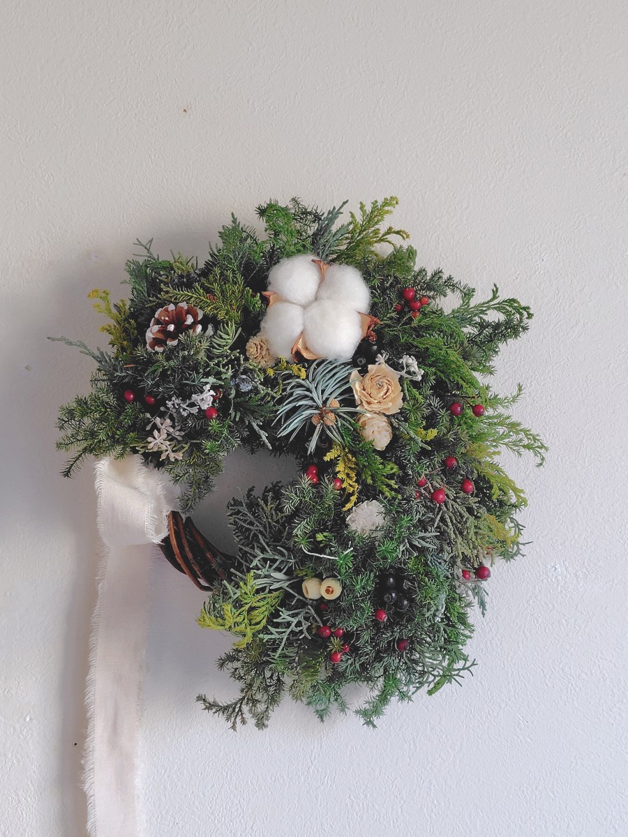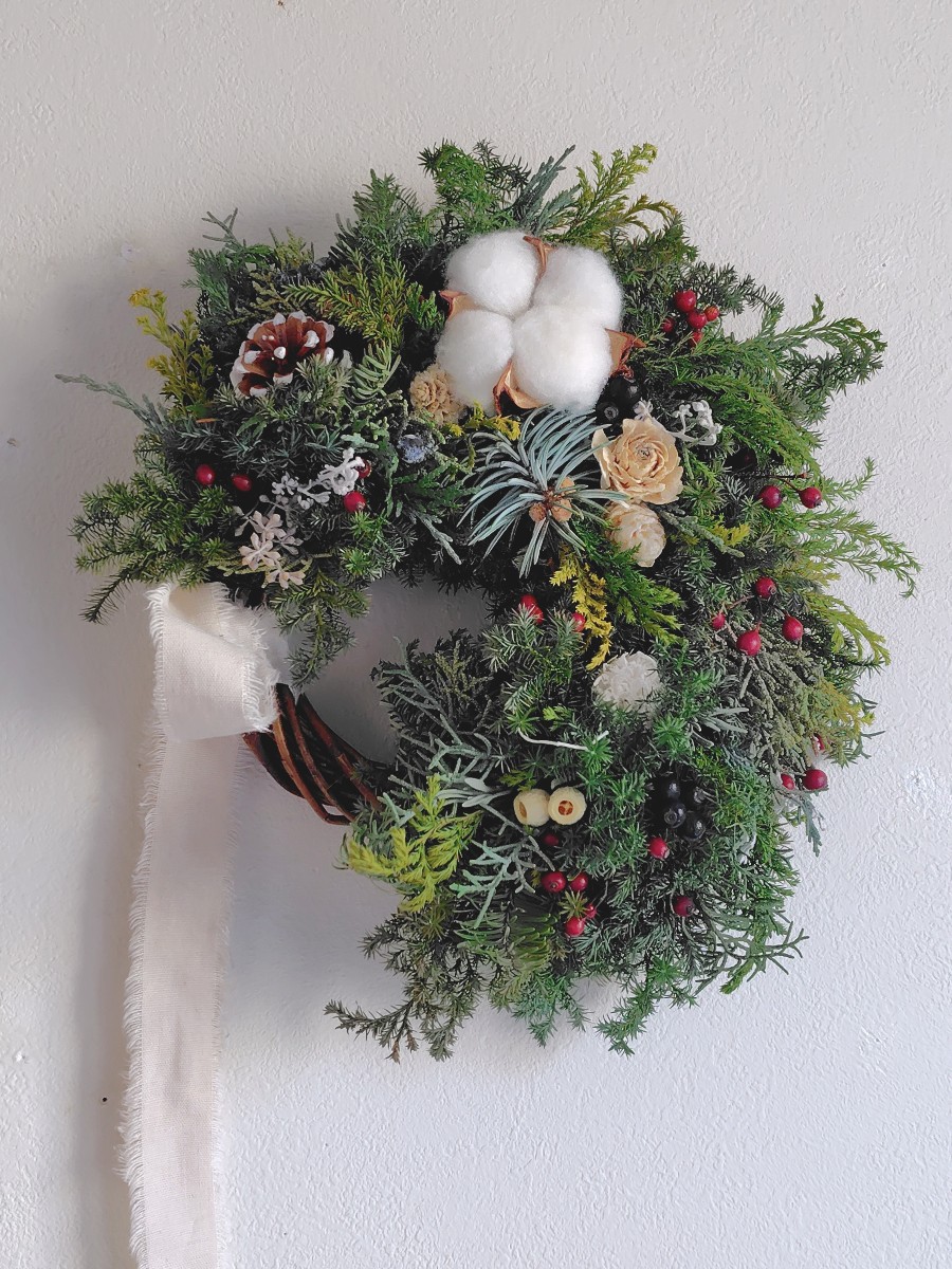 複数の針葉樹を束ねて、複雑な色合いのリースを作りました。