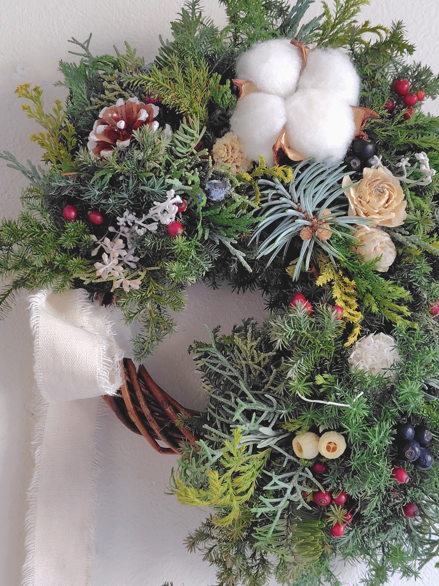 形も少し複雑なので、お好きな向きで飾って表情の違いを楽しんでいただけるリースです。